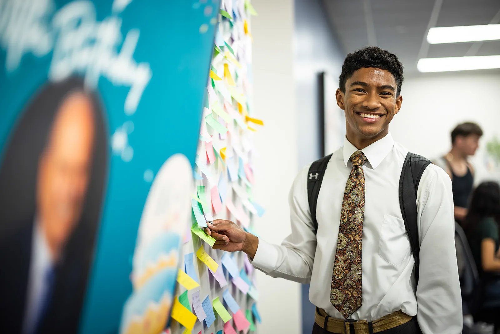 A student celebrating our religious leader's 100th birthday by writing a note between class!