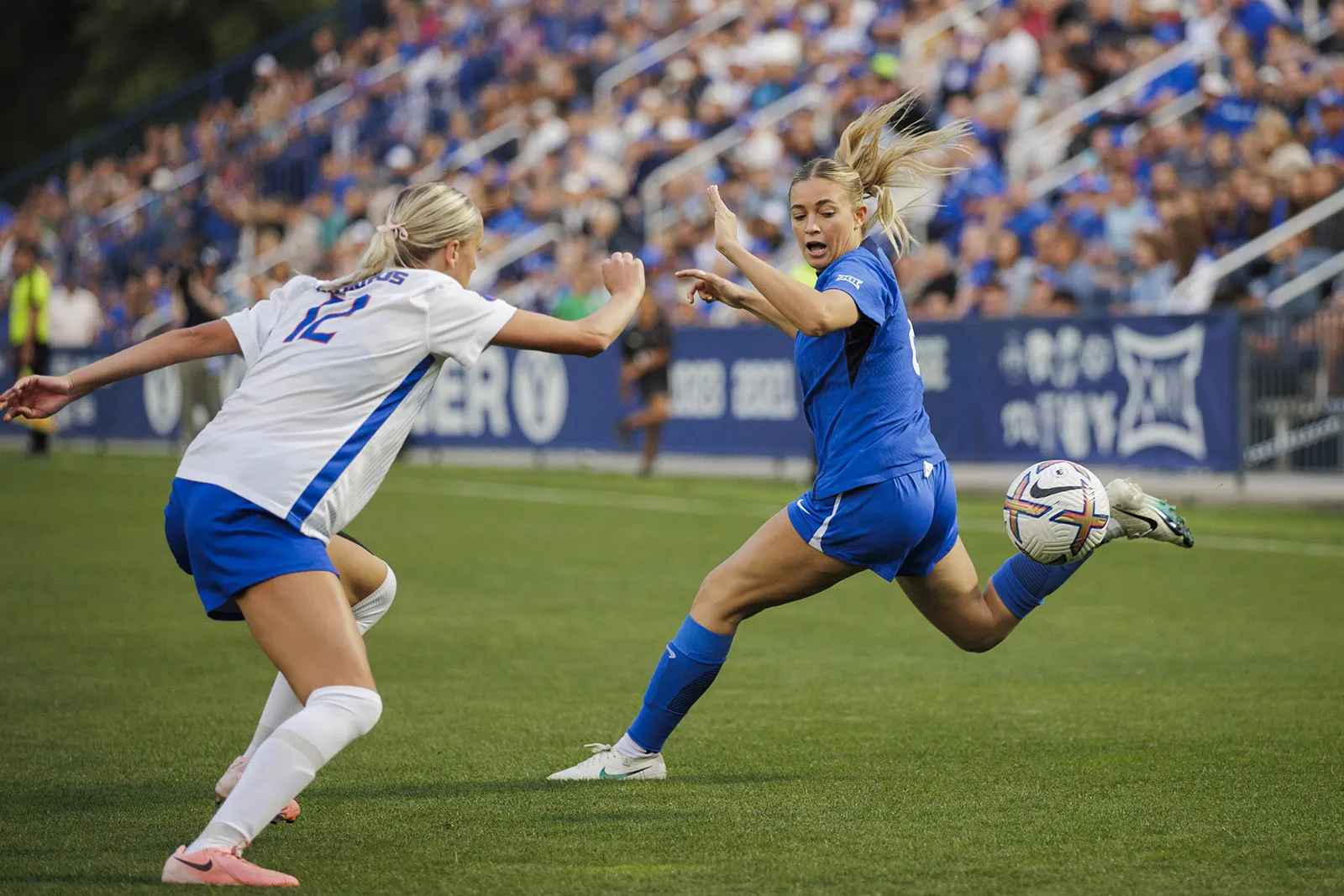 A soccer player kicks the ball behind her back to keep it from leaving the field.