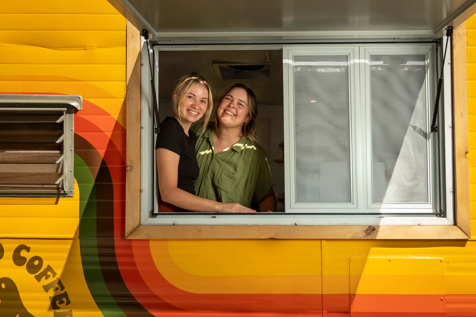 Rebecca (left) and Kennedy (right), co-owners of Lovebird Coffee, look out from their coffee truck parked on campus on September 12th, 2024.