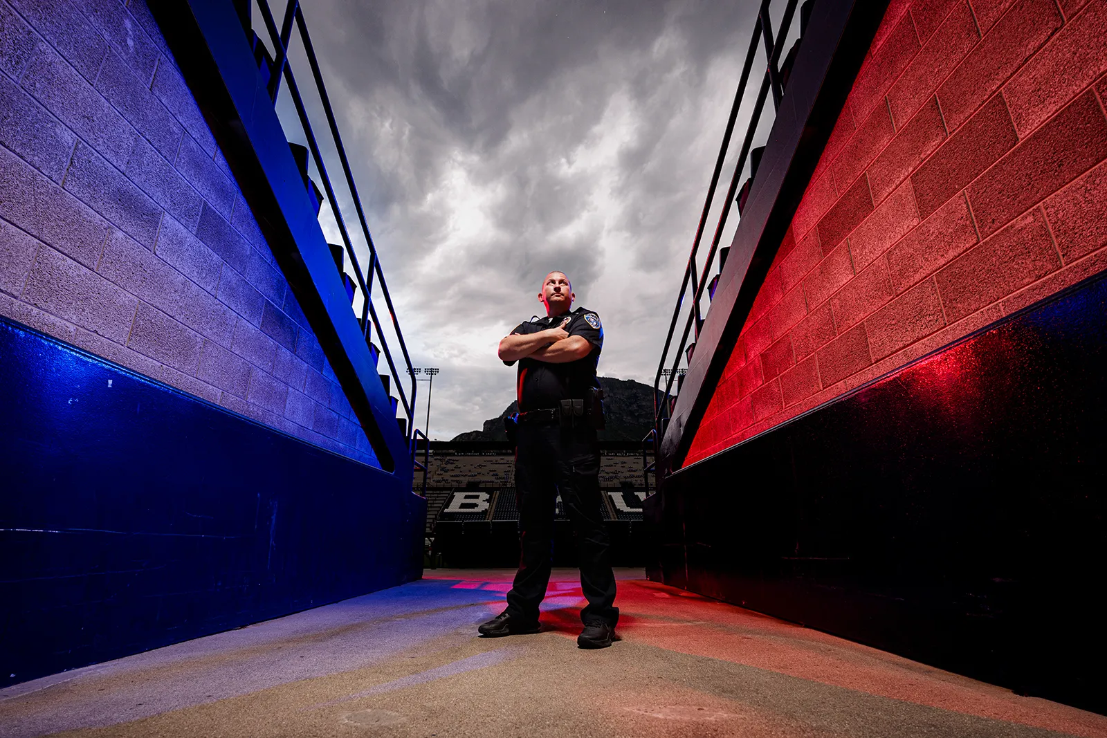 This image was taken by crossing strobes with gels behind the officer in a portal in the football stadium. The key light was suspended above the officer above the opening to the portal. The image was taken moments before it started to rain, allowing the amazing sky above.