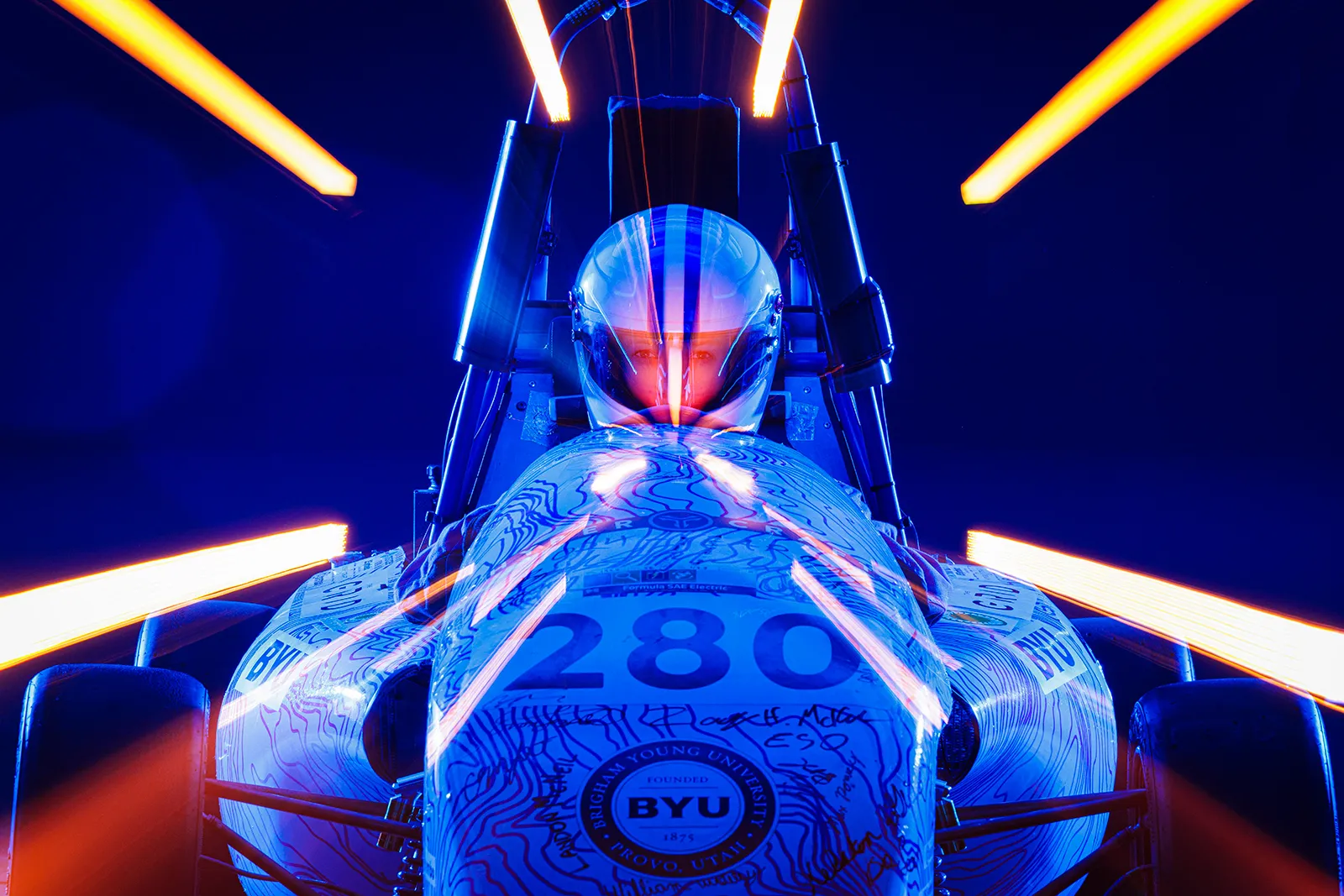 An engineering team on campus created an electric race car from scratch and I had them take it apart and reassemble it in the studio for some car photography. This image was captured all in camera. With the camera on a tripod, and zoomed in while taking a long exposure. The car is lit with blue gels and orange lights stuck to stands which creates a streak look as the camera zooms in during the exposure.