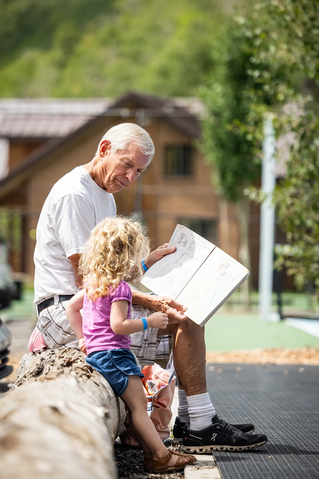 A candid moment of a grandpa with his granddaughter, at summer camp.