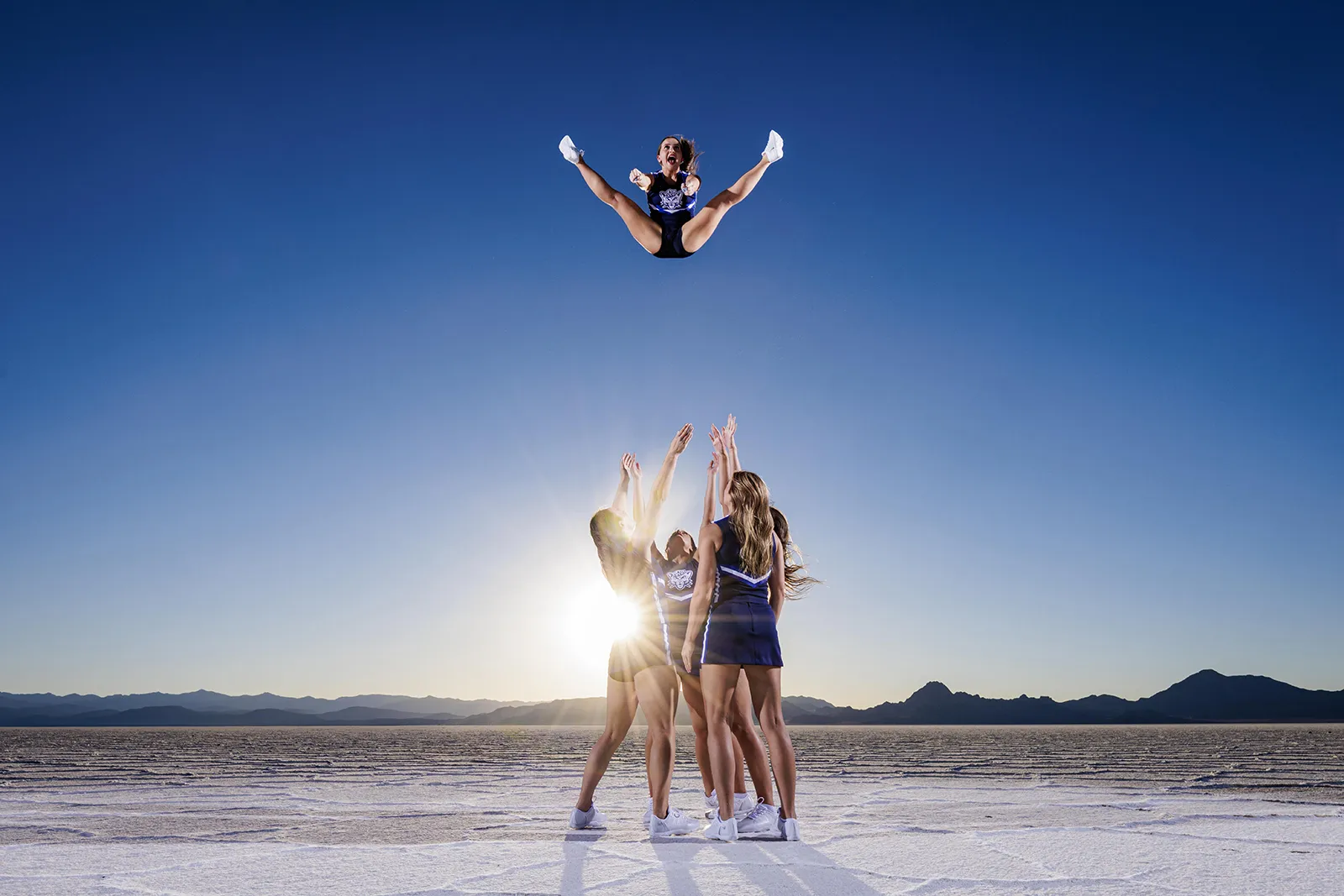 Cheerleaders perform a basket toss at the Bonneville Salt Flats.