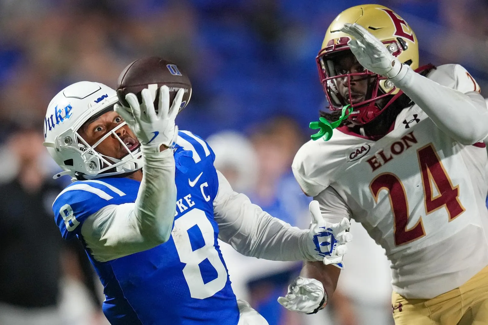 DURHAM, NORTH CAROLINA - AUGUST 30: Dylan Tucker #24 of the Elon Phoenix defends a pass to Jordan Moore #8 of the Duke Blue Devils during the second half of the game at Wallace Wade Stadium on August 30, 2024 in Durham, North Carolina.