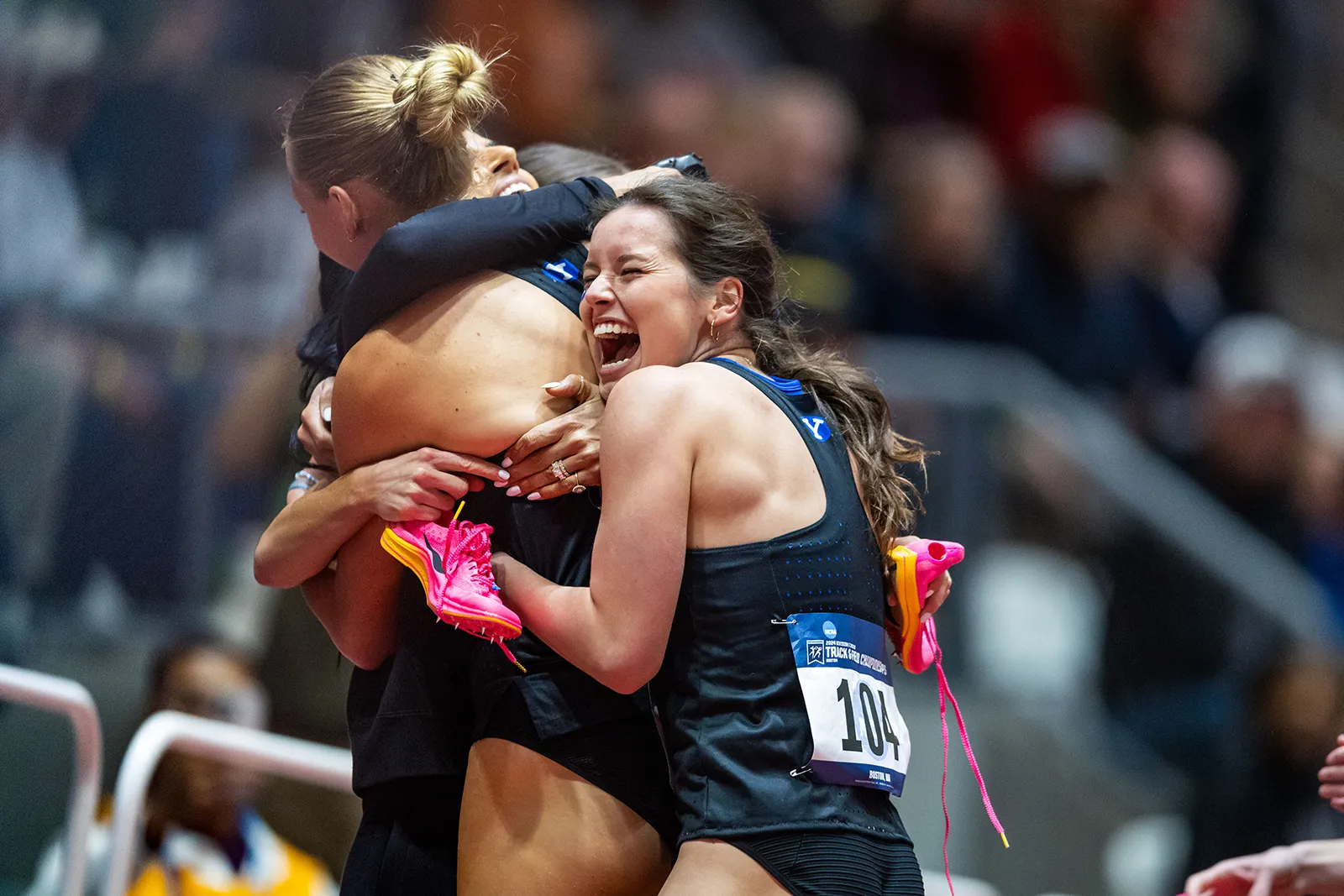 The women's Distance Medley Relay team celebrates on the track just after winning at the indoor national championships.