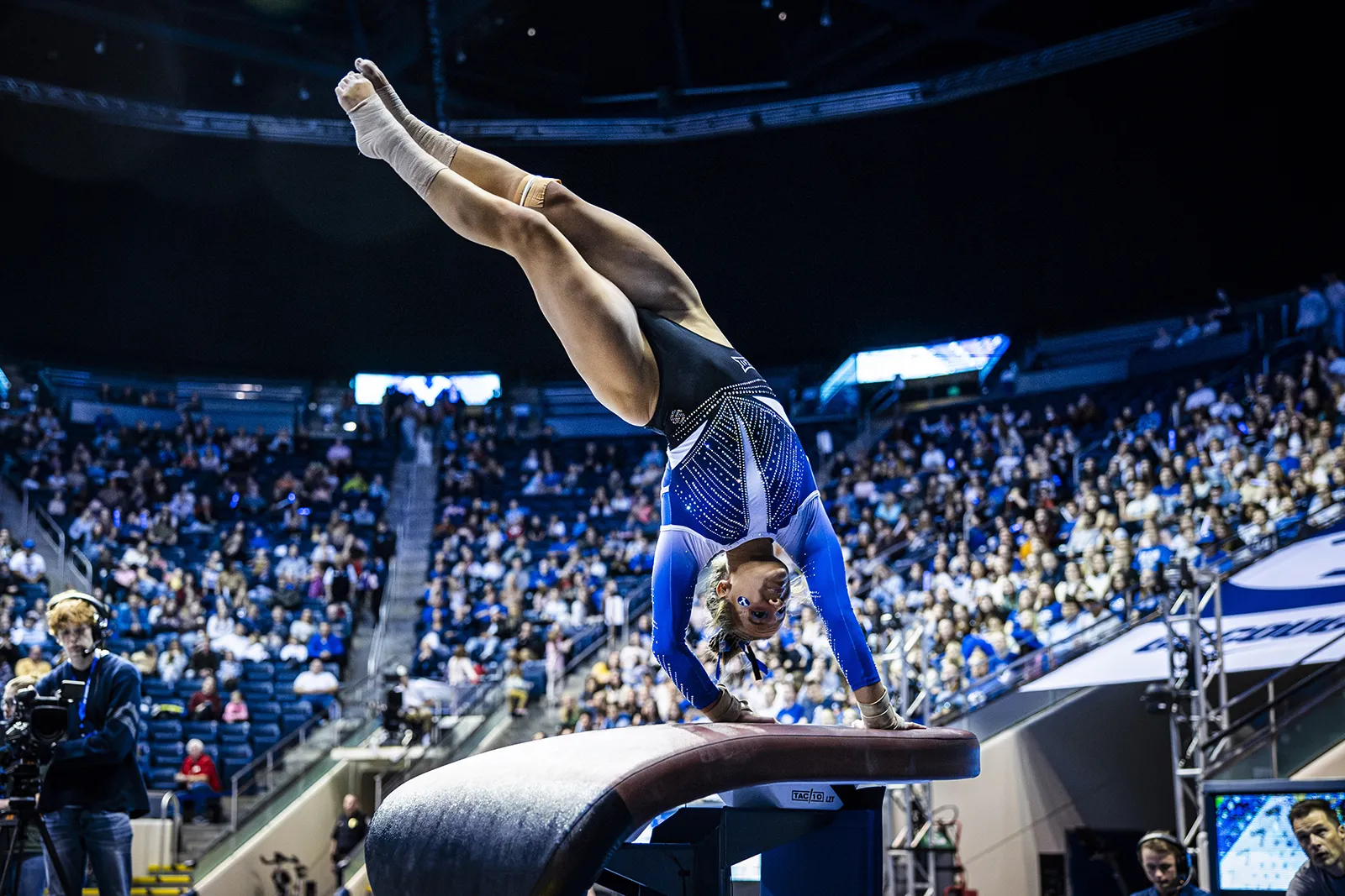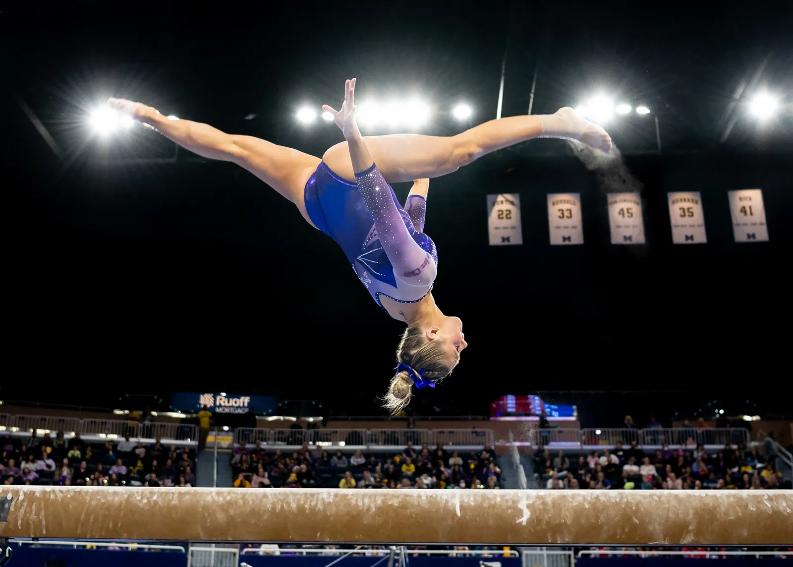A University of Michigan gymnast executes perfect form on the balance beam under Crisler Center's lights, which illuminate her extension and body lines.