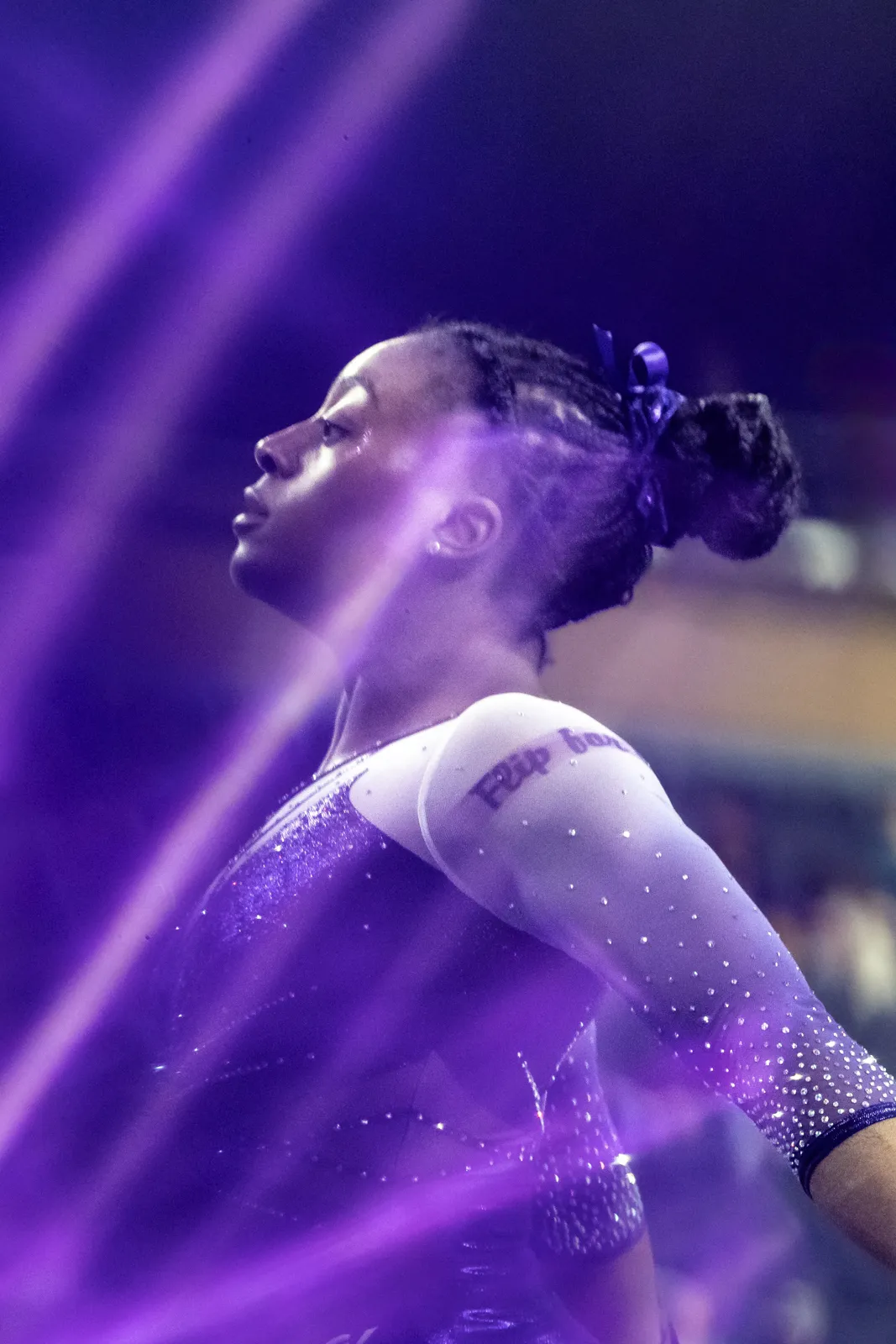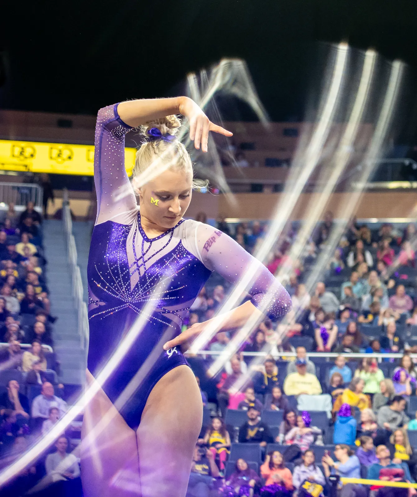 After landing her tumbling pass, a University of Michigan gymnast (wearing purple for pancreatic cancer awareness) strikes a confident pose as the photographer uses some unique special effects.