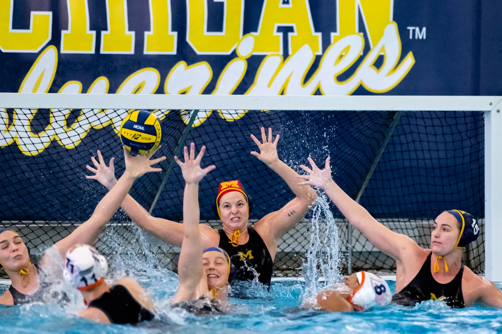 Several University of Michigan water polo players react to an incoming shot on goal with defensive hands in the air, forming a literal high-five.