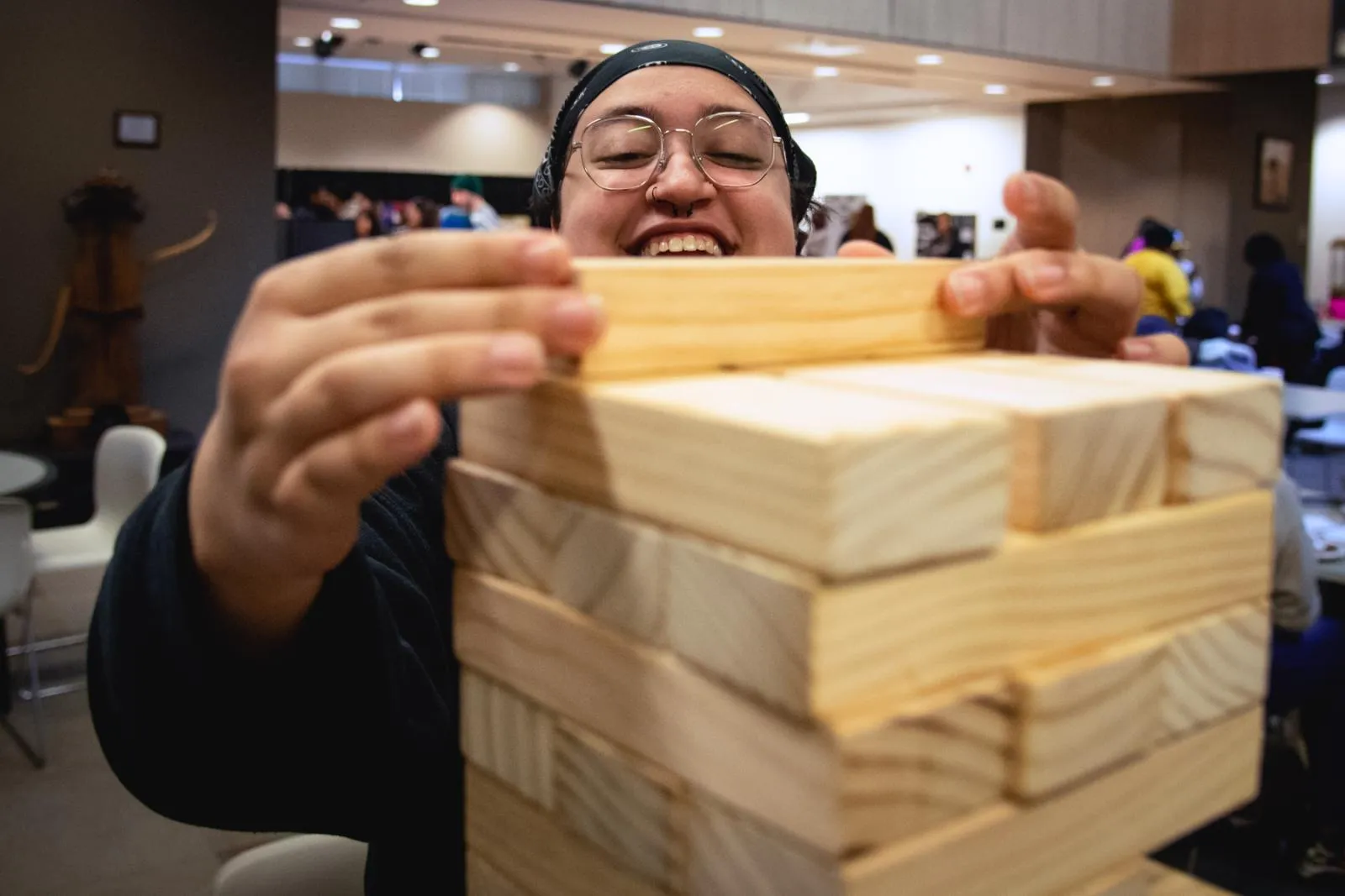 Caught in a tense moment: the delicate balance of a Jenga tower, moments before the next move.