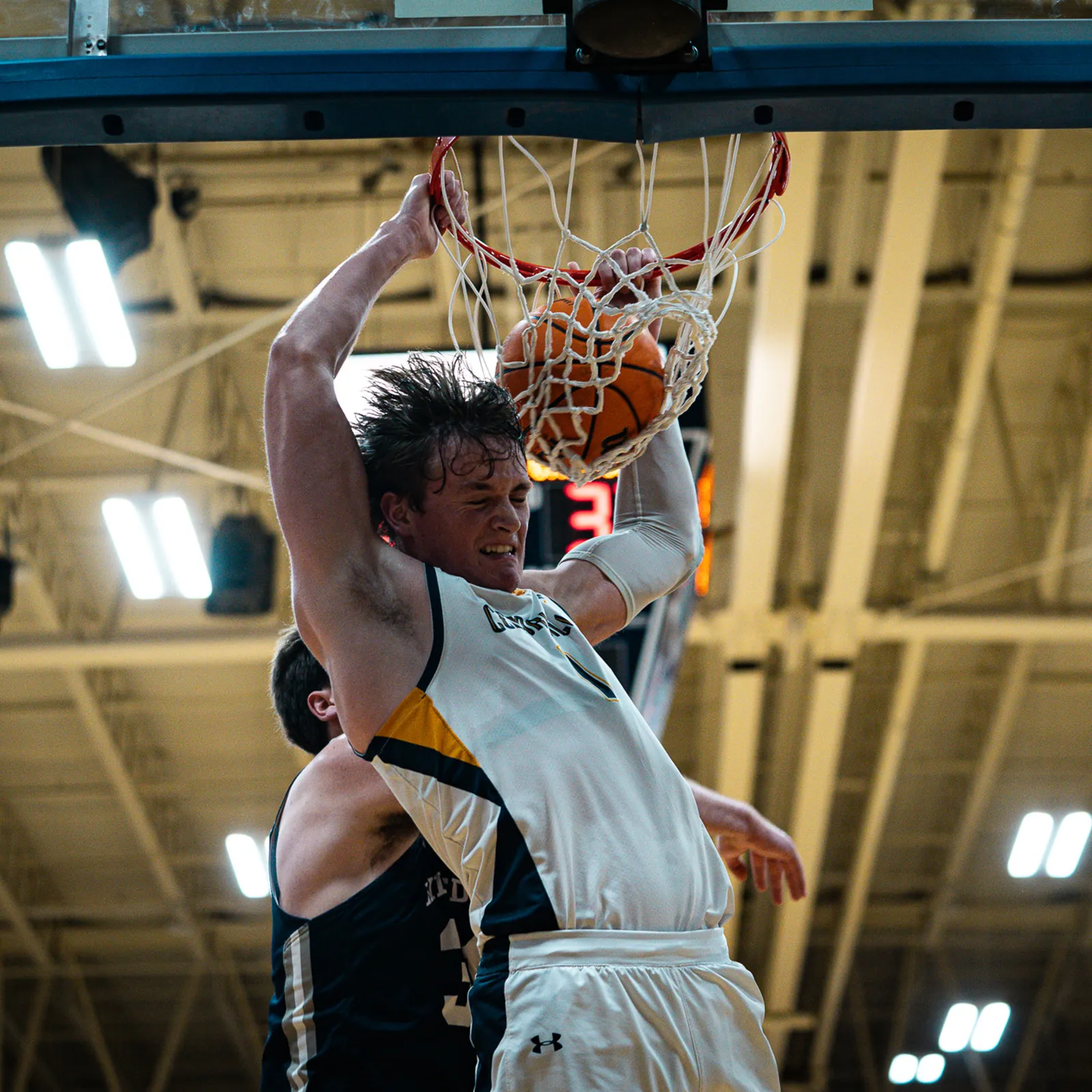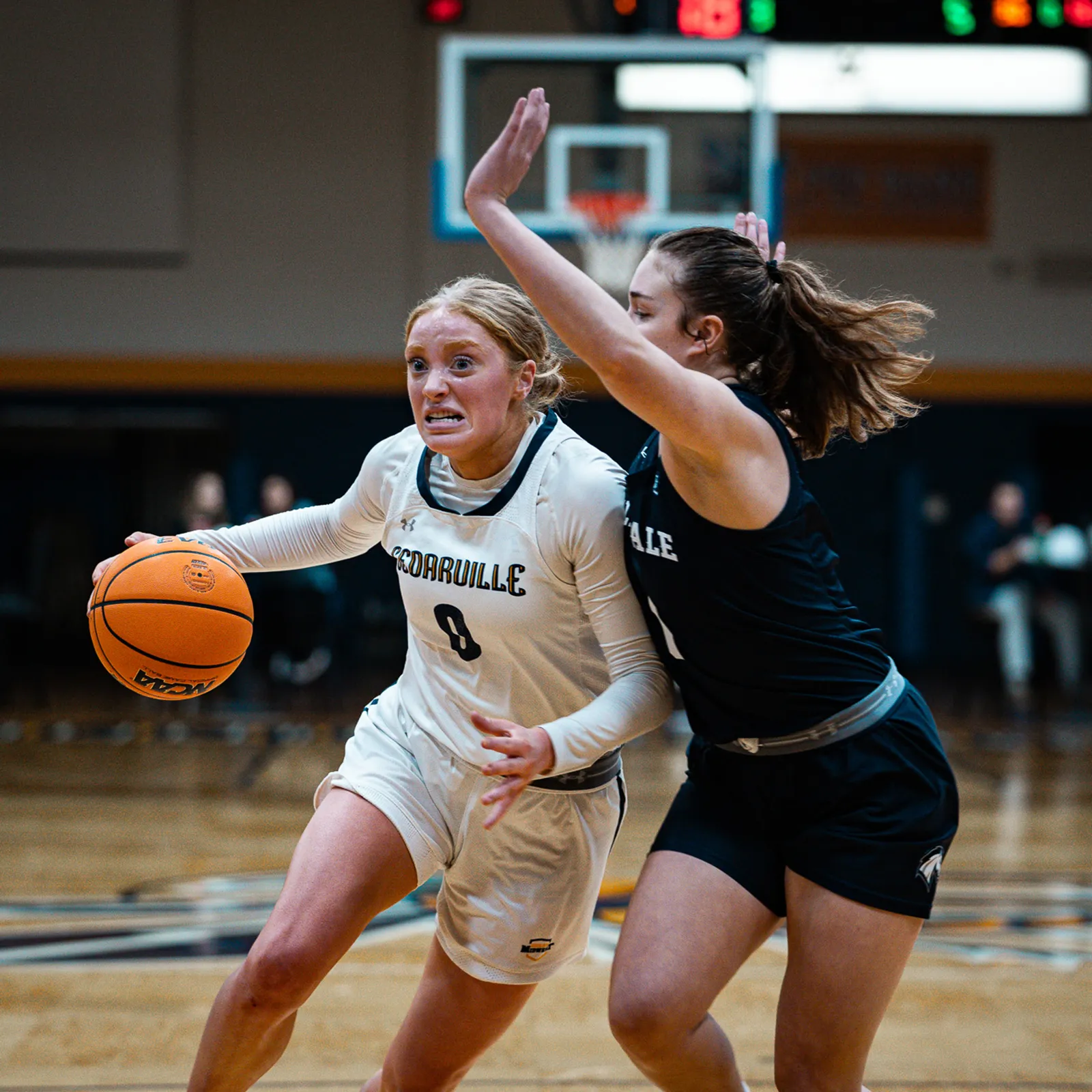 Cedarville University Yellow Jackets Women basketball play aggressively in a matchup.