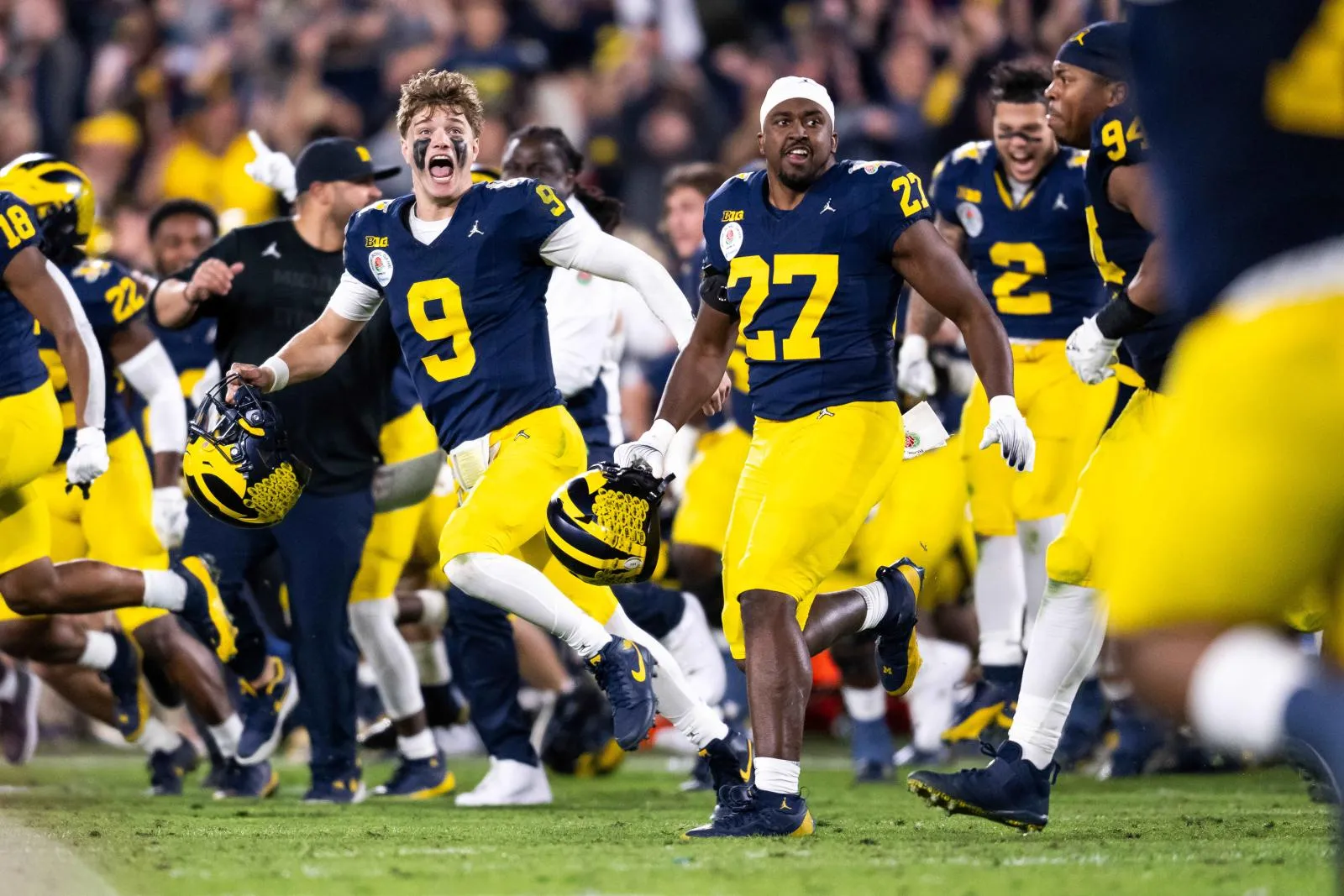 Quarterback JJ McCarthy #9 of the Michigan Wolverines runs onto the field after winning the Rose Bowl on January 1, 2024 in Pasadena, CA.