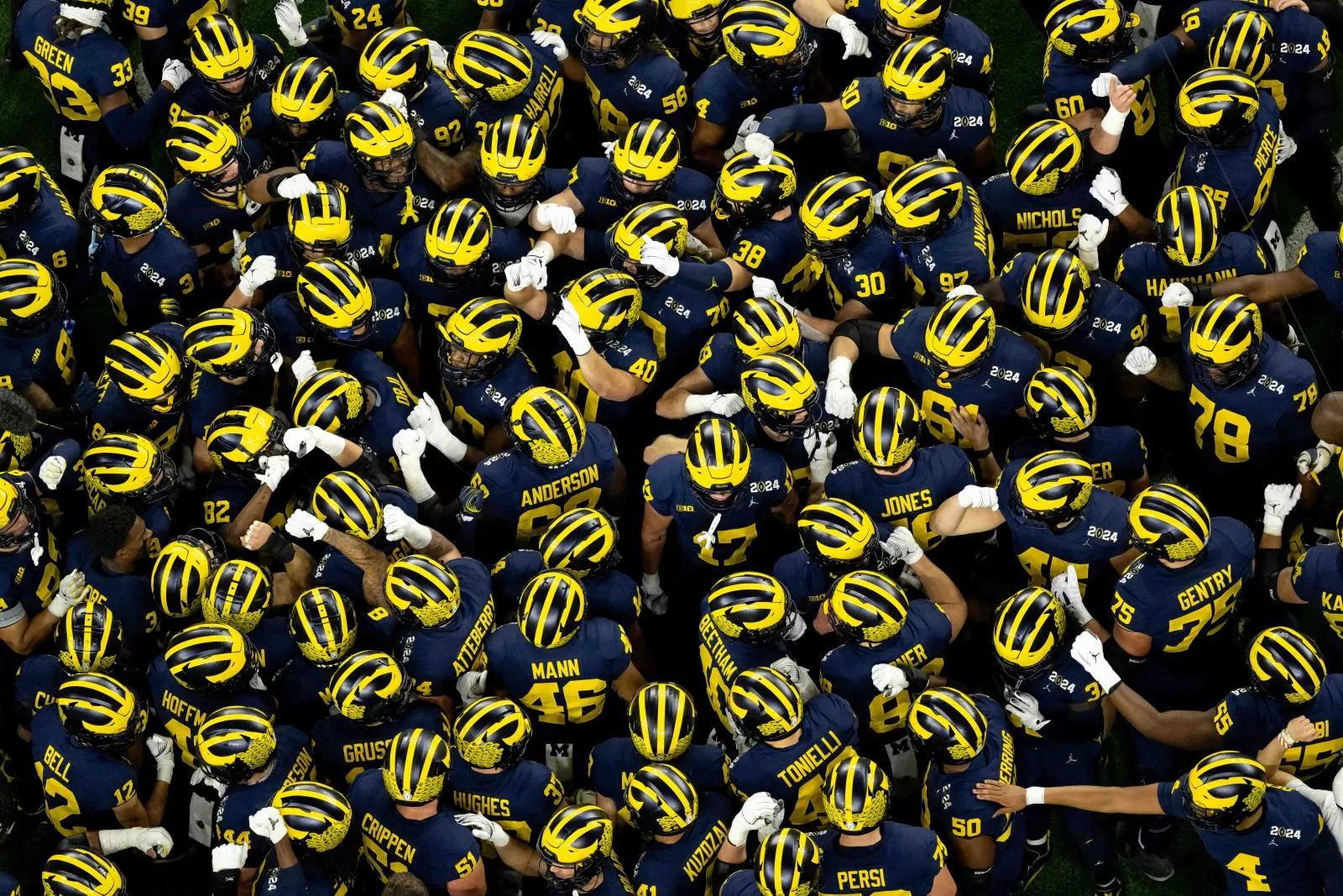 The Michigan Wolverines huddle before the National Championship game against Washington on January 8, 2024 in Houston, TX.