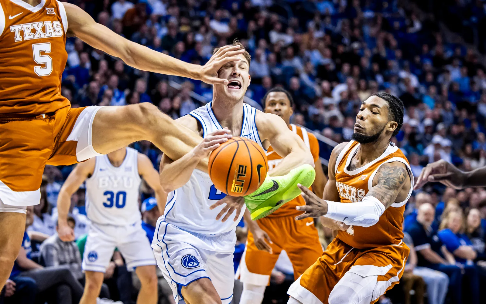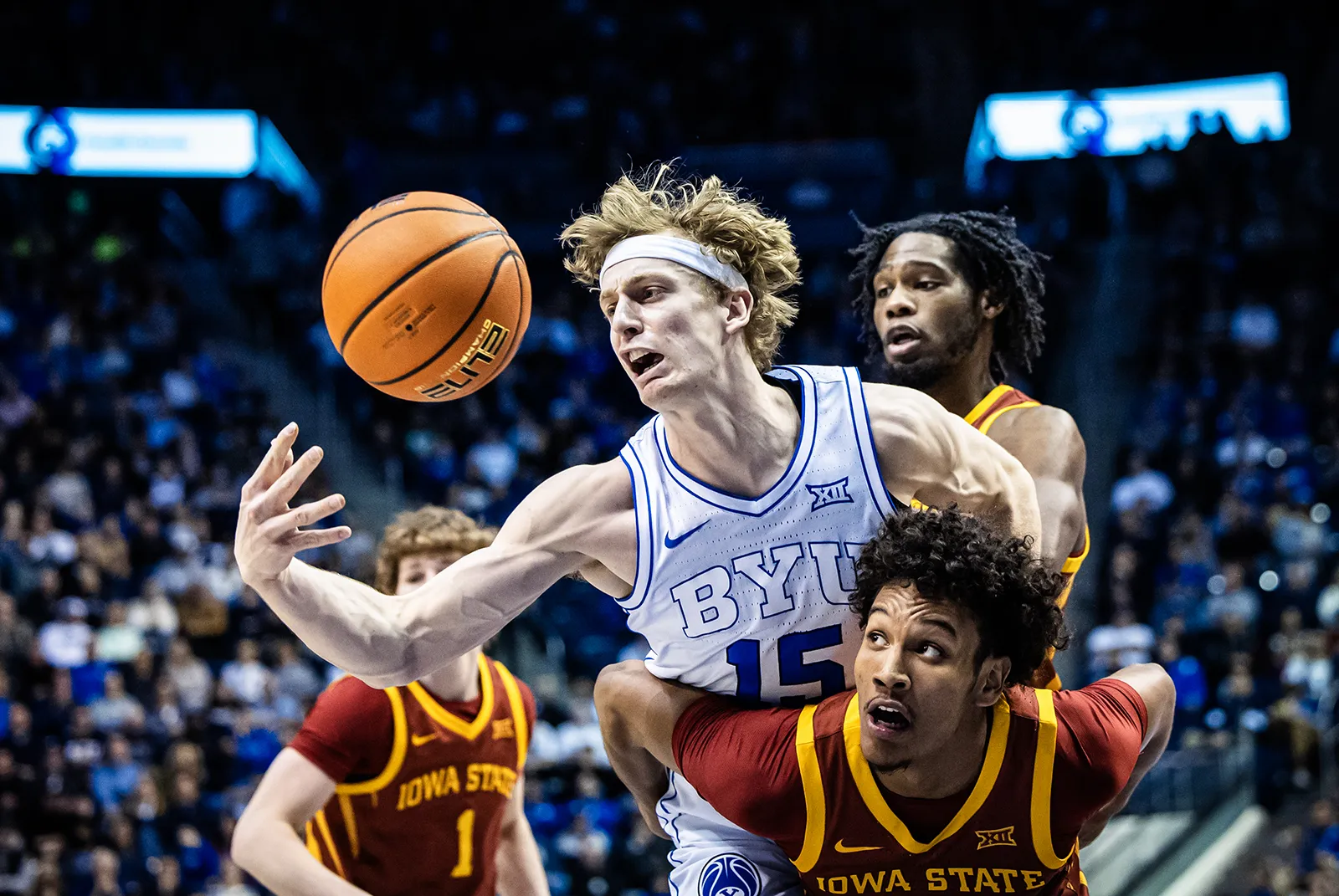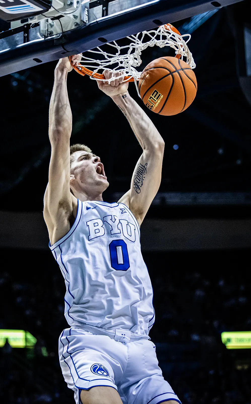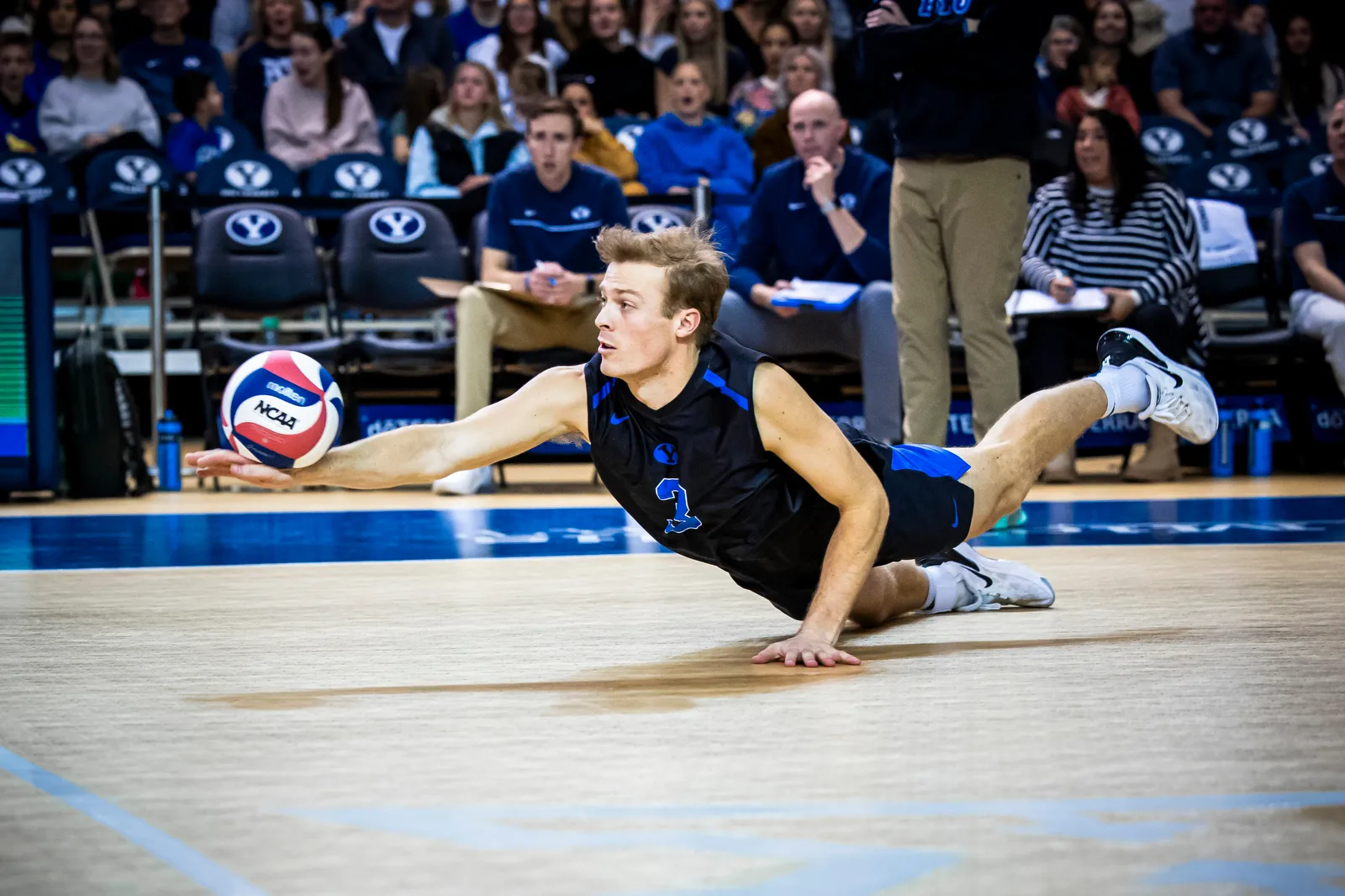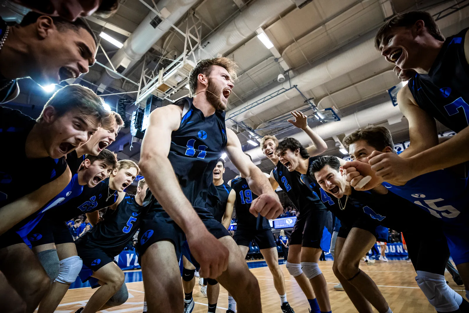 The BYU men's volleyball team celebrates a big win over their opponent.
