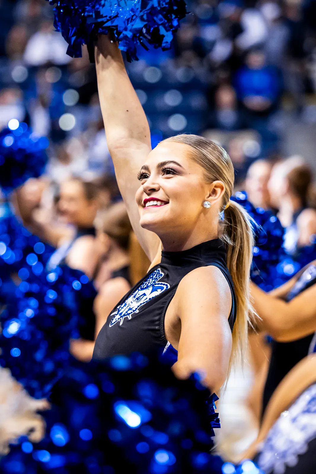 A cheerleader smiles and pumps up the crowd before a basketball game.