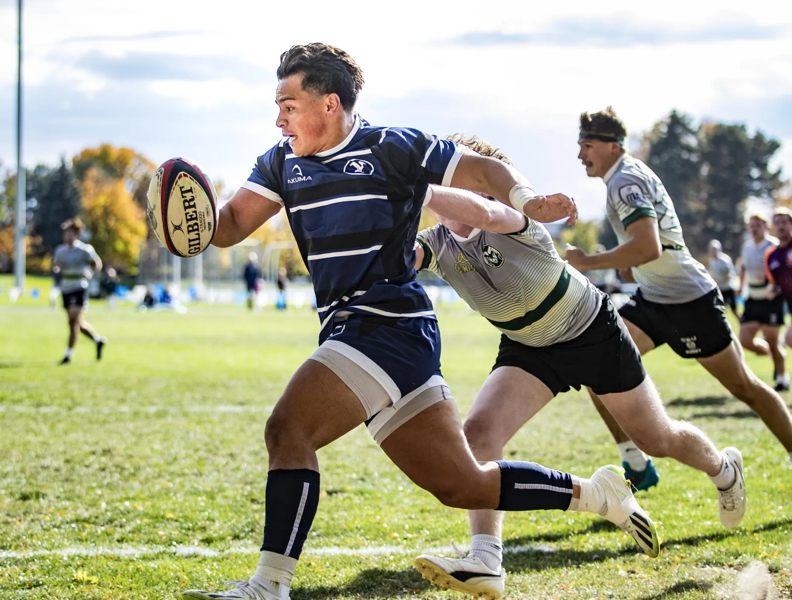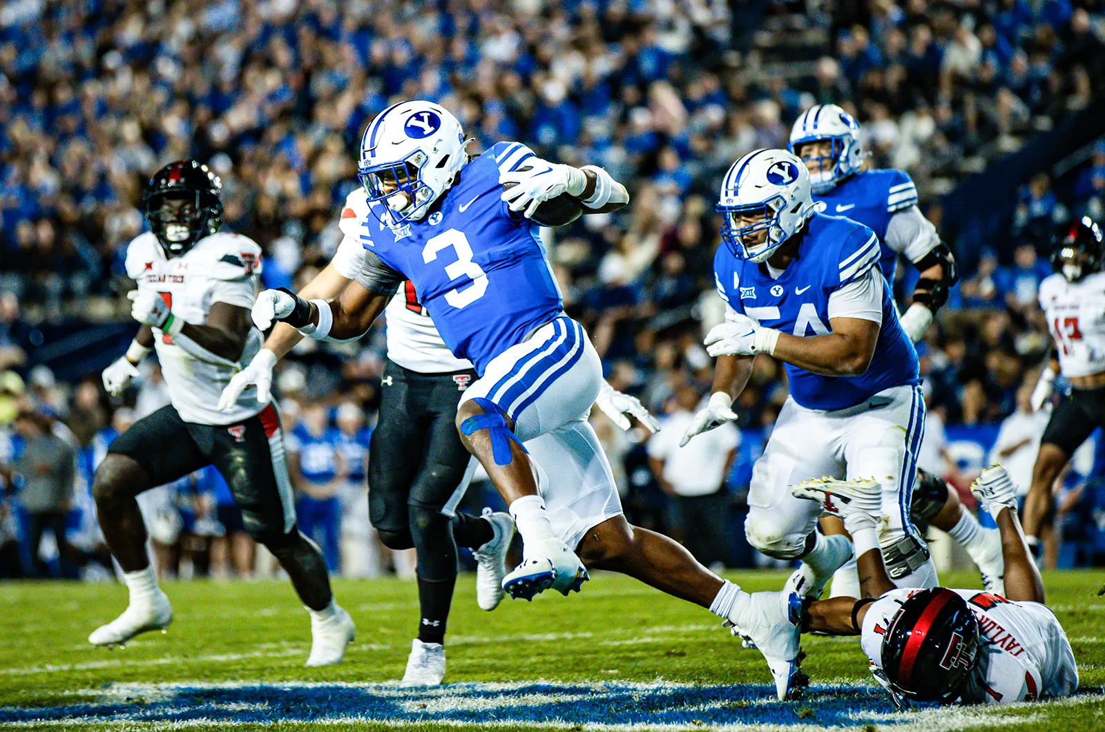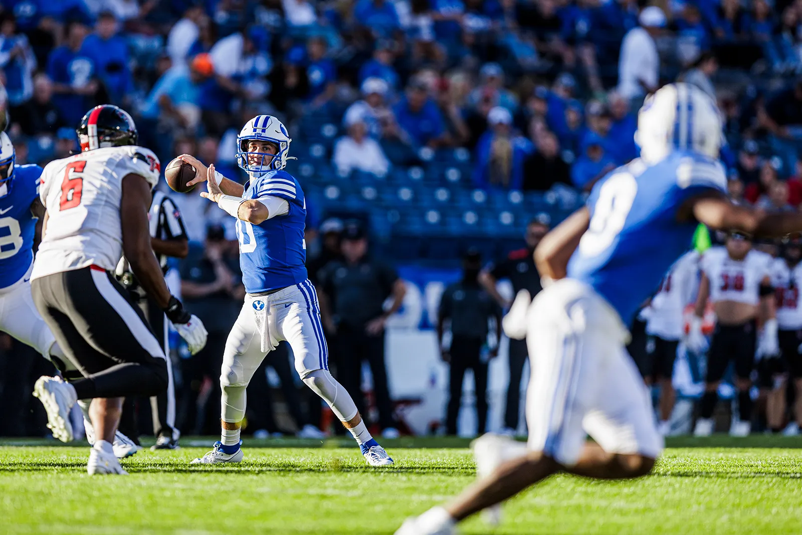 Quarterback prepares to throw the ball to a waiting wide receiver.