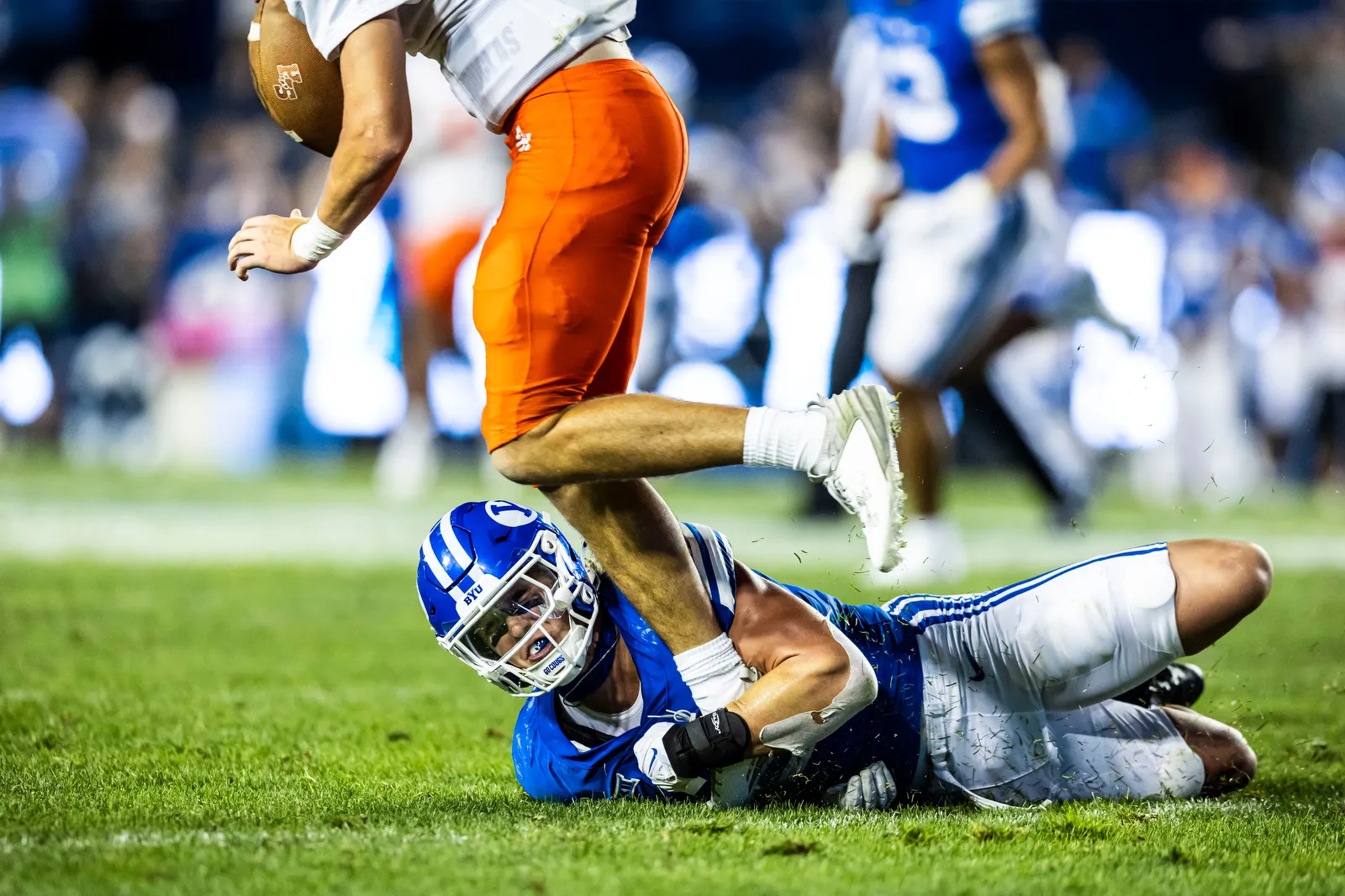 A BYU football player locks down the opposing QB's ankle to get a sack.