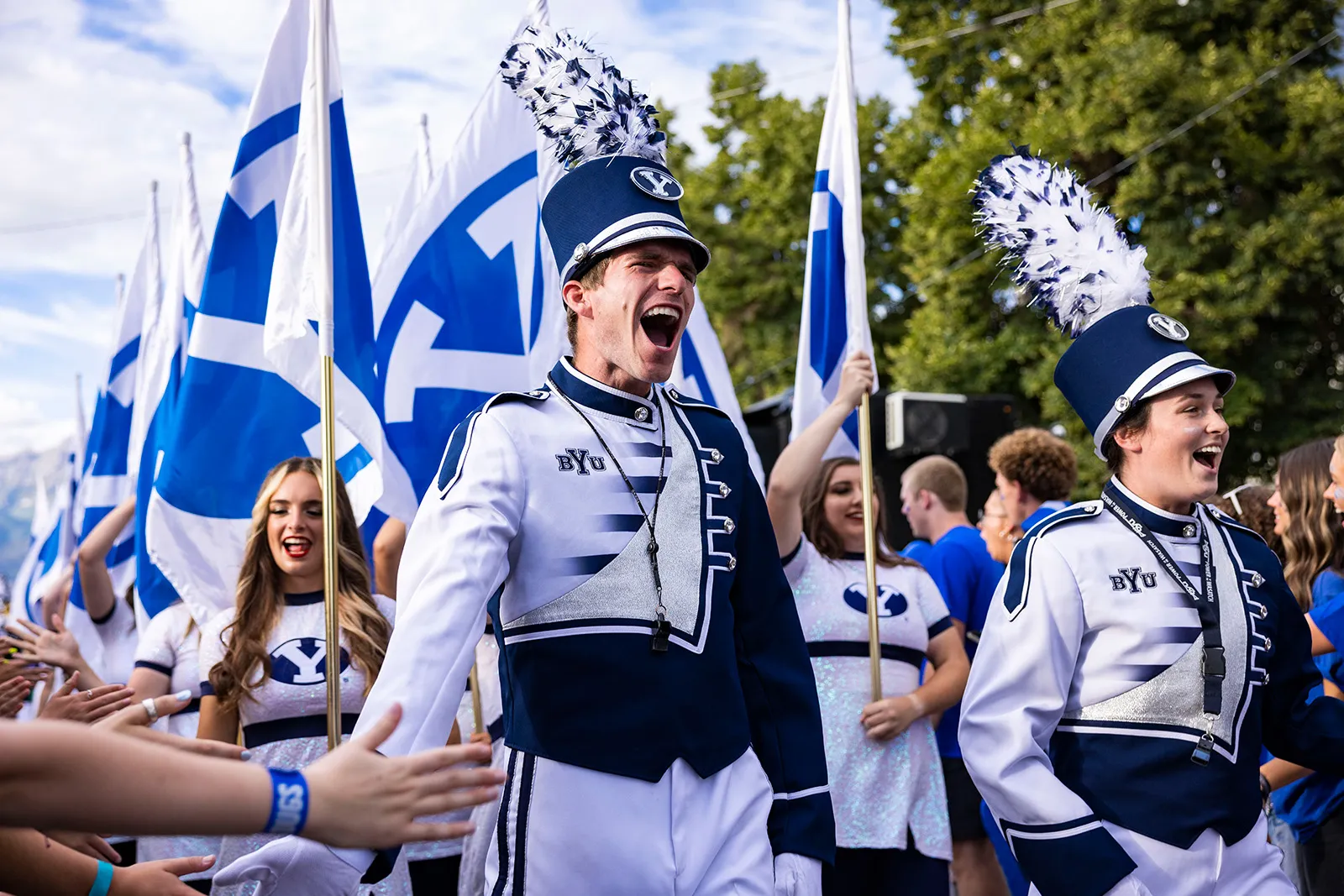 Marching band headed into the stadium before a big game. One of the students in the band was very excited and kept yelling and getting the crowd excited.