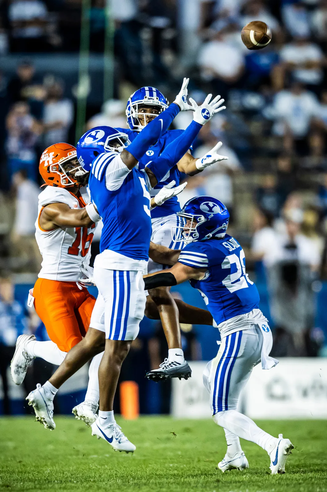 A swarm of BYU Football players jump to intercept a throw towards the end of the game.