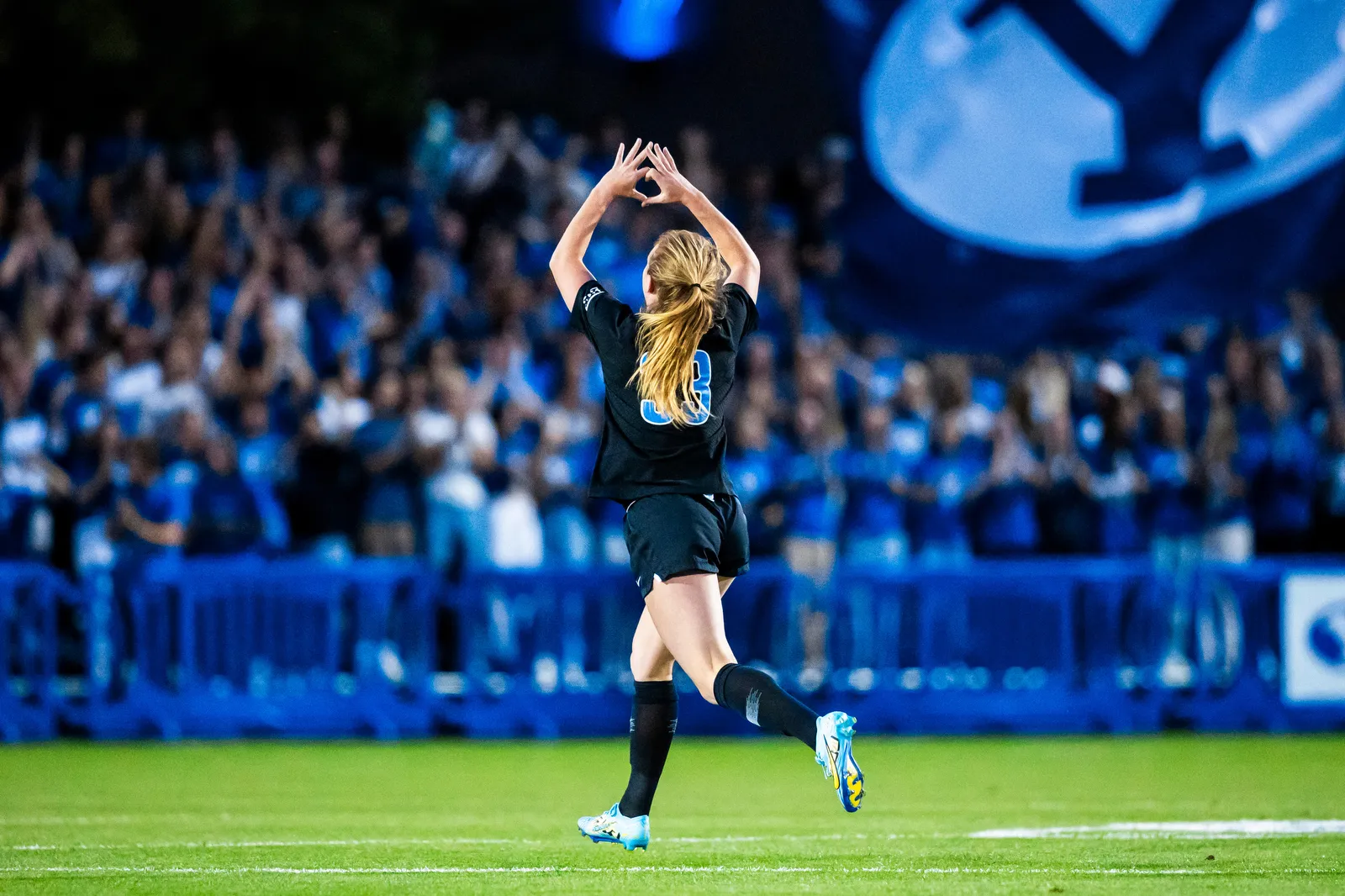 A BYU women's soccer player shows her love to the student section after scoring a goal