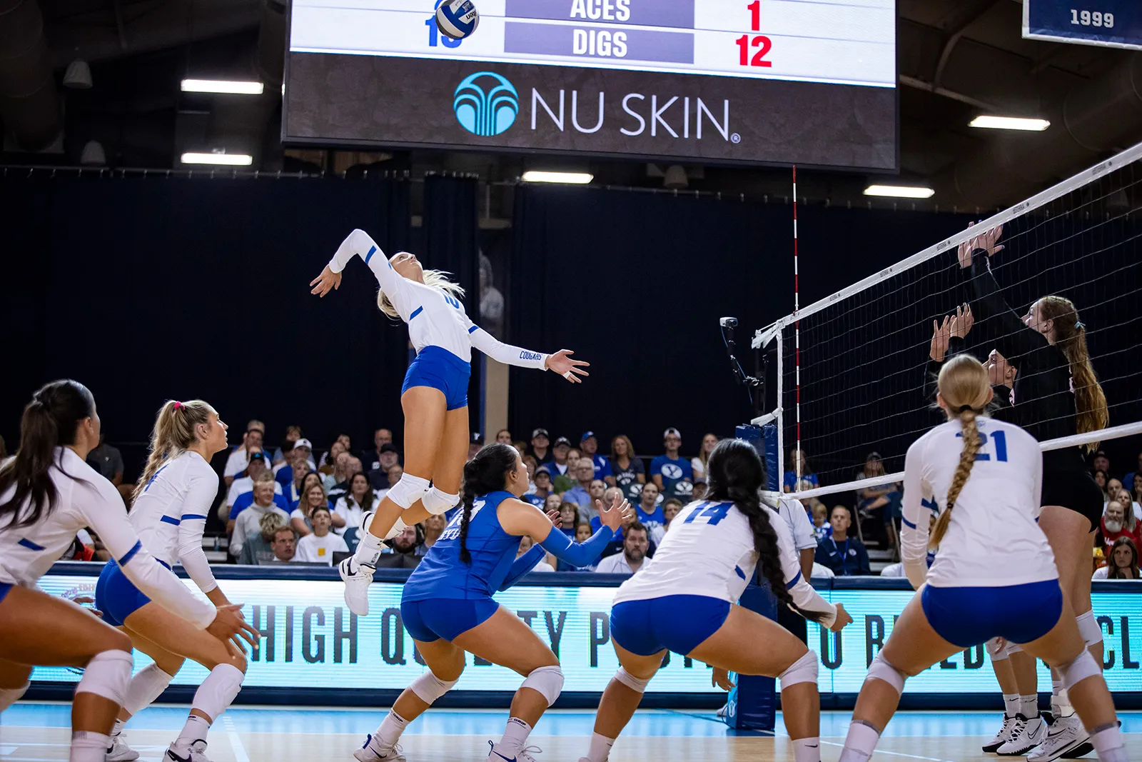As a player goes up for the spike, her teammates and opponents wait in anticipation.