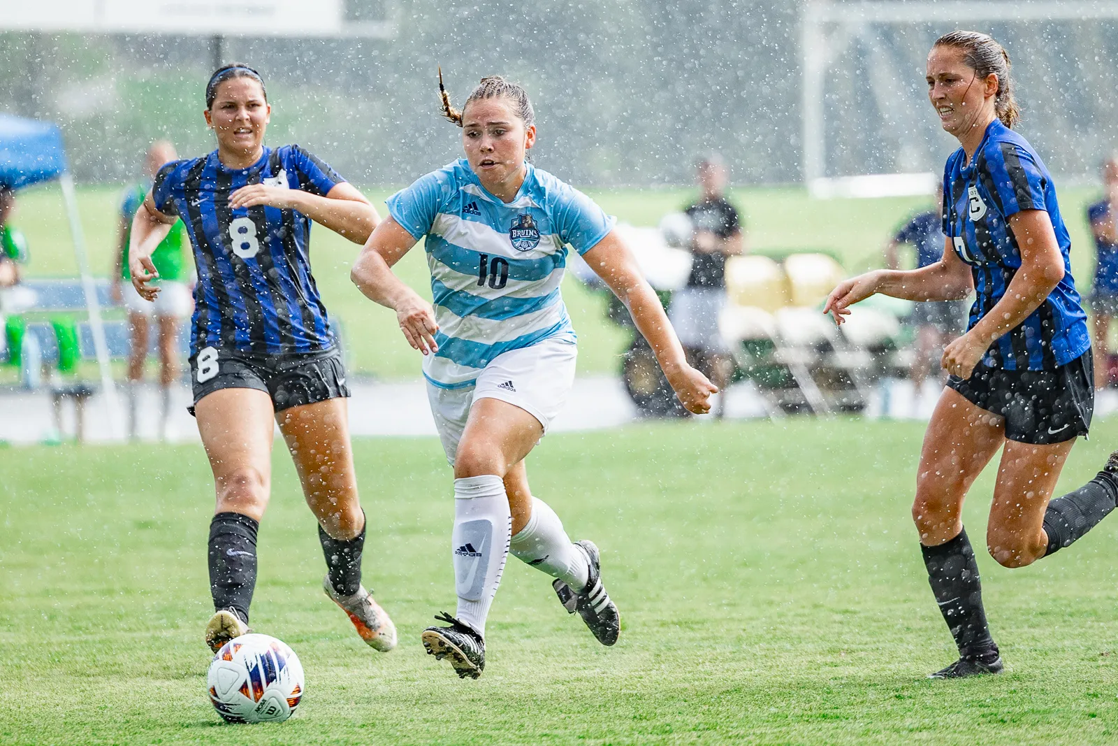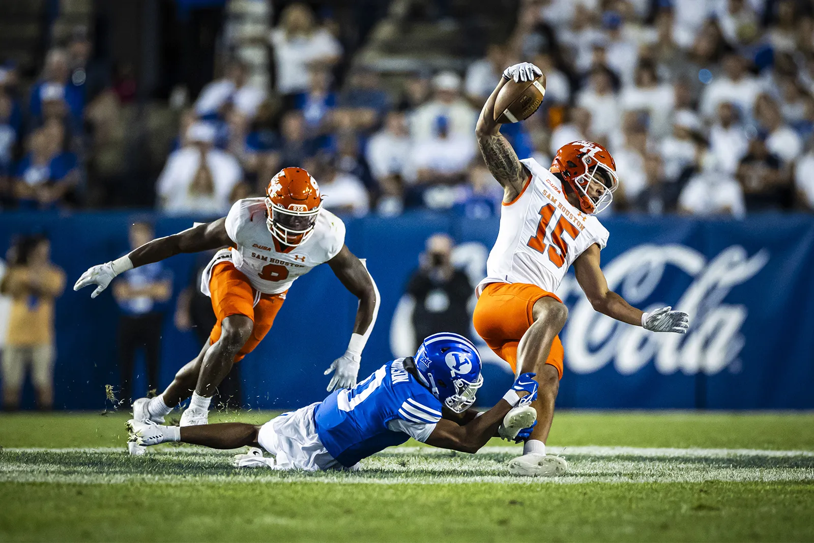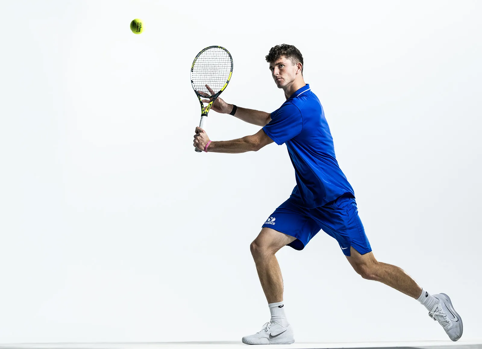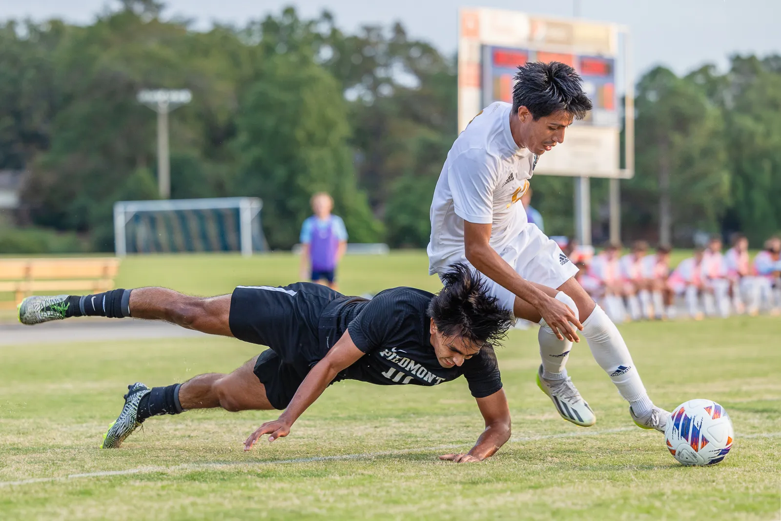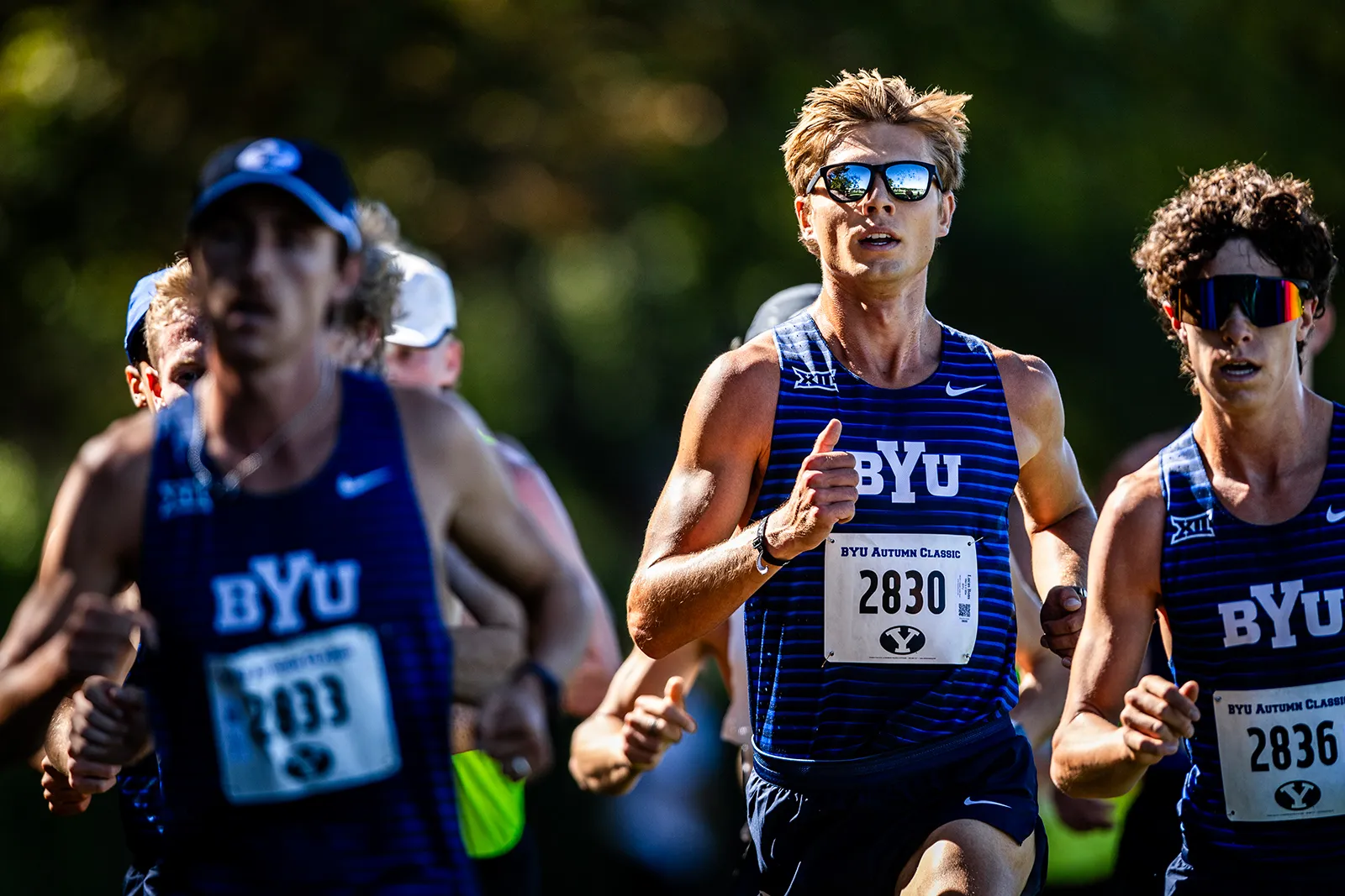 Cross country runners race past gaps in the trees as harsh sunlight spills across their faces.