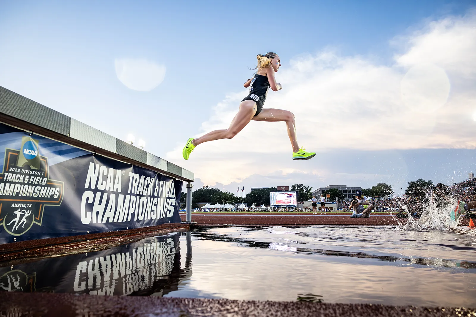 Steeplechase runner Lexi Lexy Halladay-Lowry jumps over the water pit during her qualifying race for the national finals.