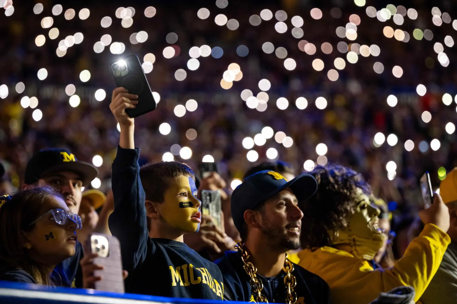A young fan waves a flashlight during the first night game with new lights installed at Michigan Stadium.