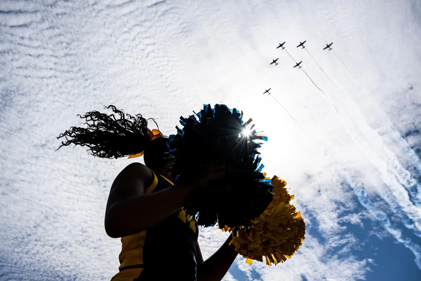 A cheerleader waves her poms as five L-39 Albatros Jets fly above the field before a game against East Carolina.