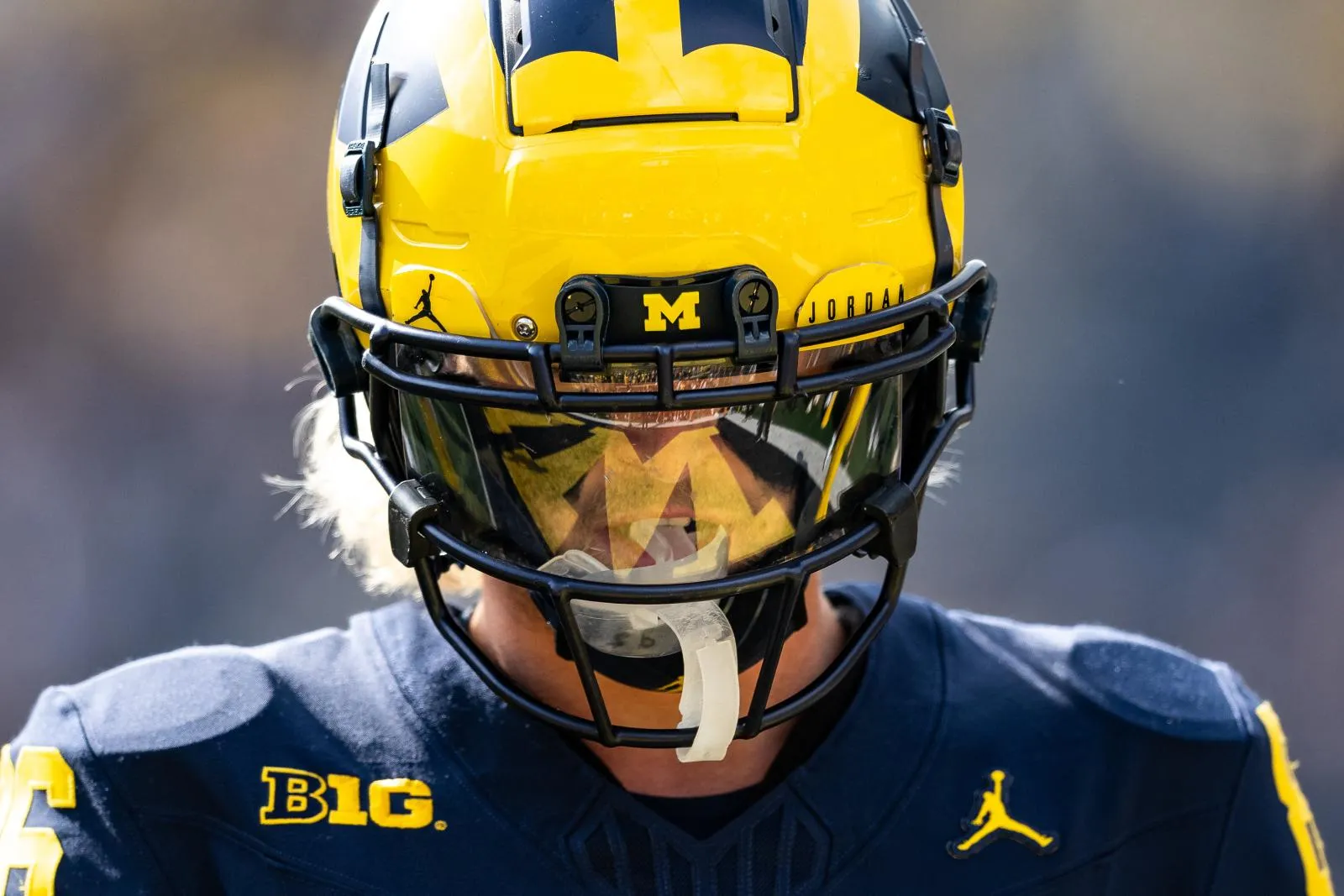 A 'Block M' is reflected in the visor of Zach Peterson (86) before a game against Rutgers.