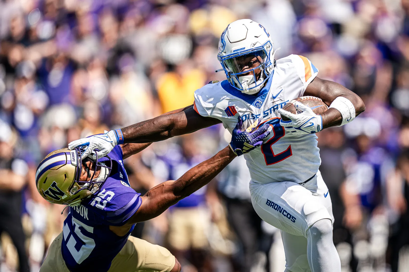 Boise State Running back #2 Ashton Jeanty stiff-arms an Washington defender to score the first touchdown of the Broncos' 2023 season.