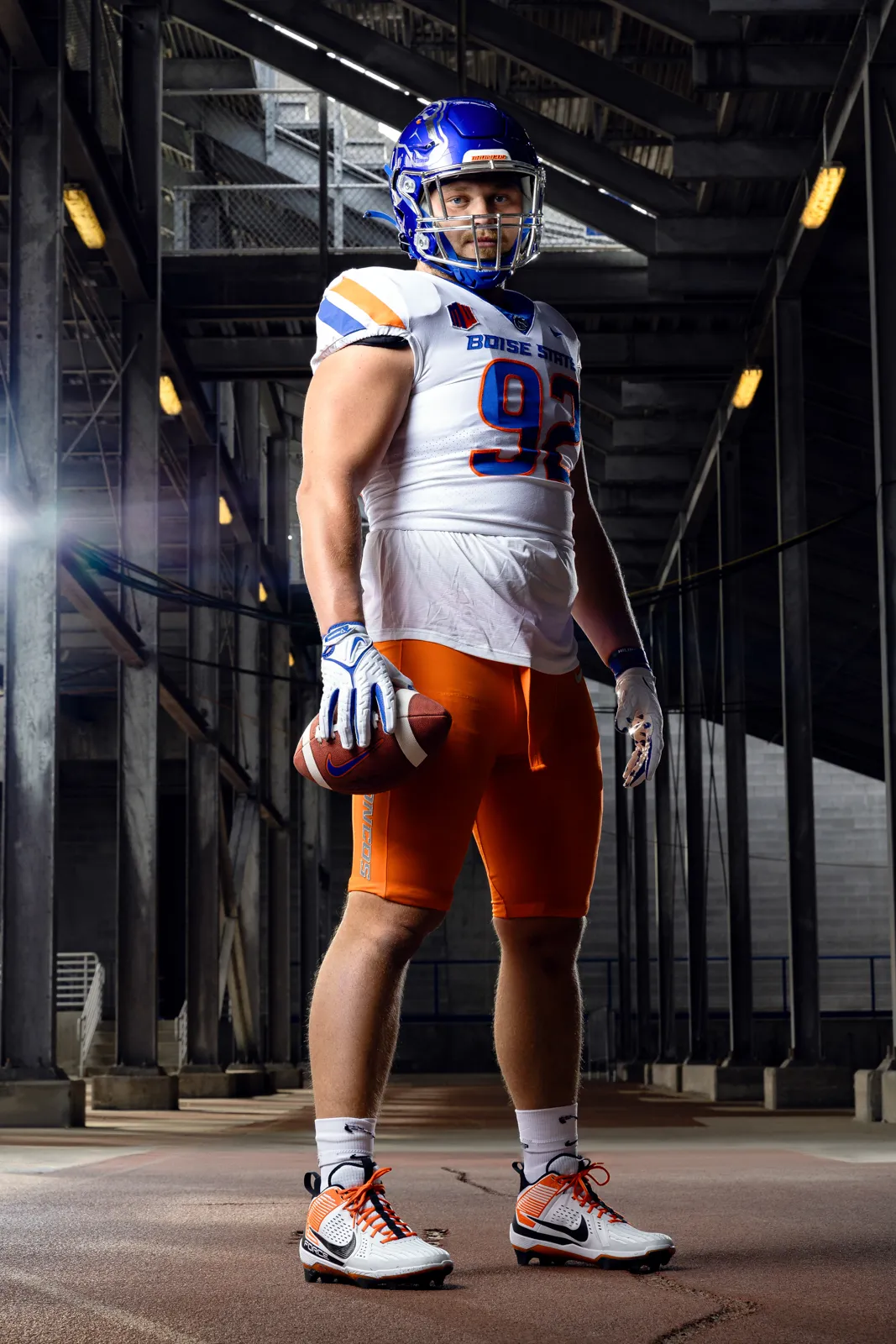 A Boise State football player poses for a uniform photo before taking on Memphis.