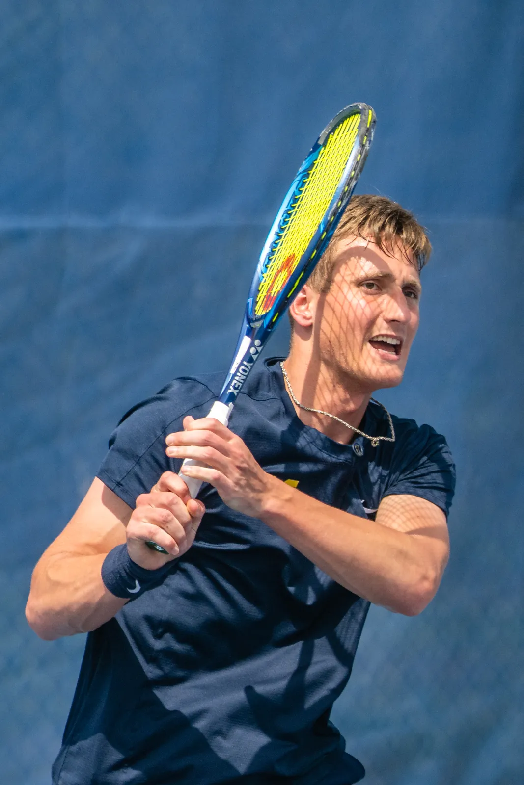 Shadows from his tennis racquet strings fall on the face of University of Michigan's Ondrej Styler during NCAA Super Regional competition at the Varsity Tennis Center in Ann Arbor, MI.