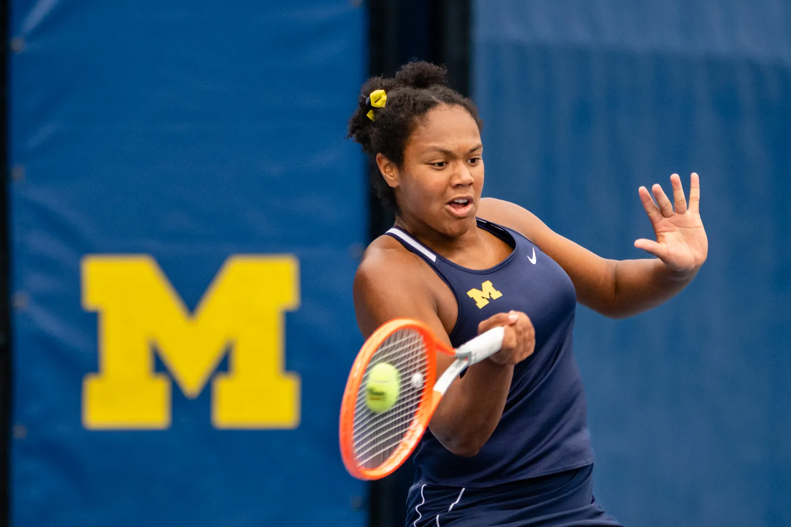 The forehand of University of Michigan's Jaedan Brown smashes the ball against her racquet strings as she returns the ball to her competitor during the NCAA Super Regional action at the Varsity Tennis Center in Ann Arbor, MI.