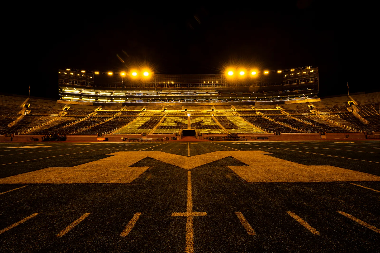 A general view of the maize lights at Michigan Stadium on August 31, 2023.