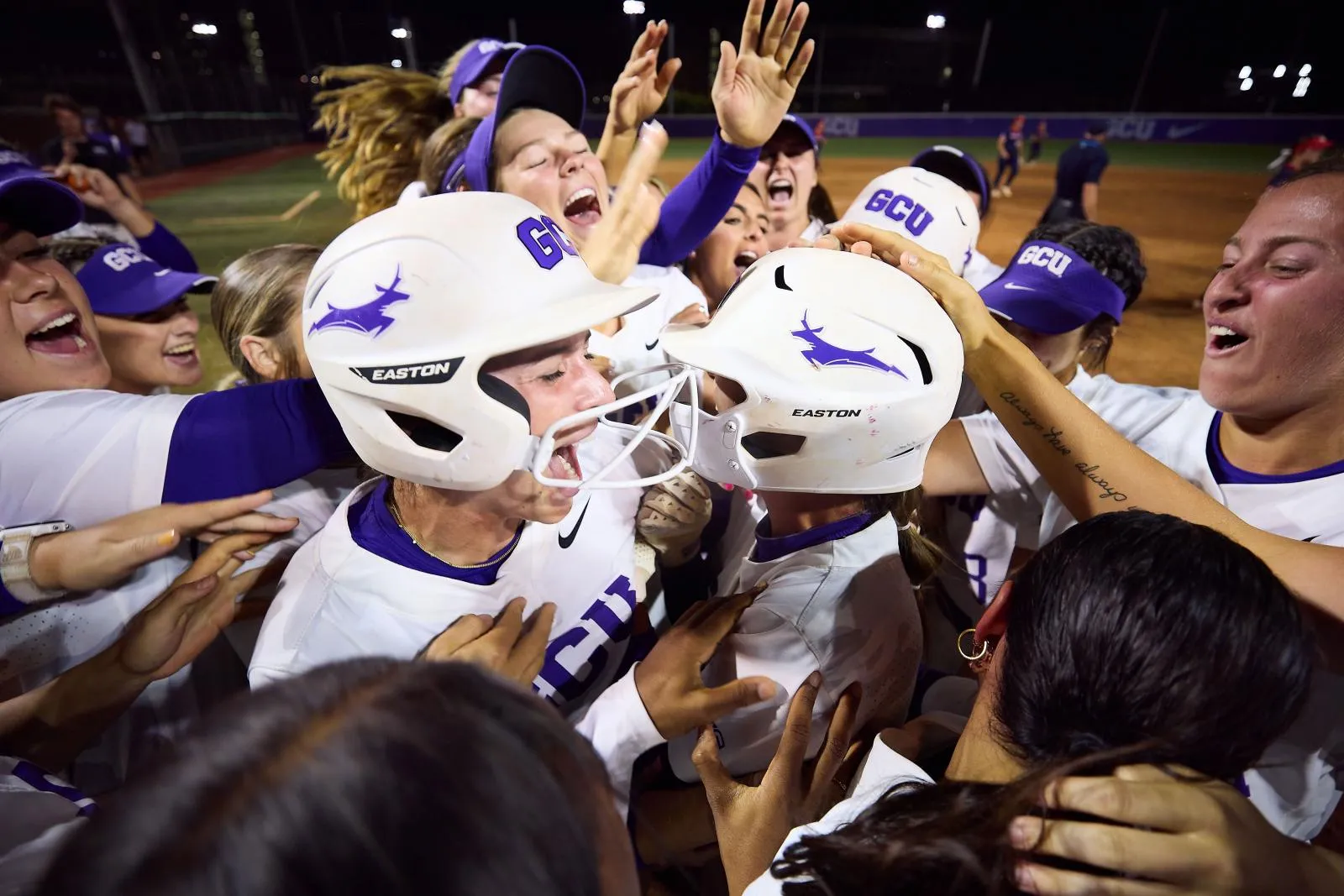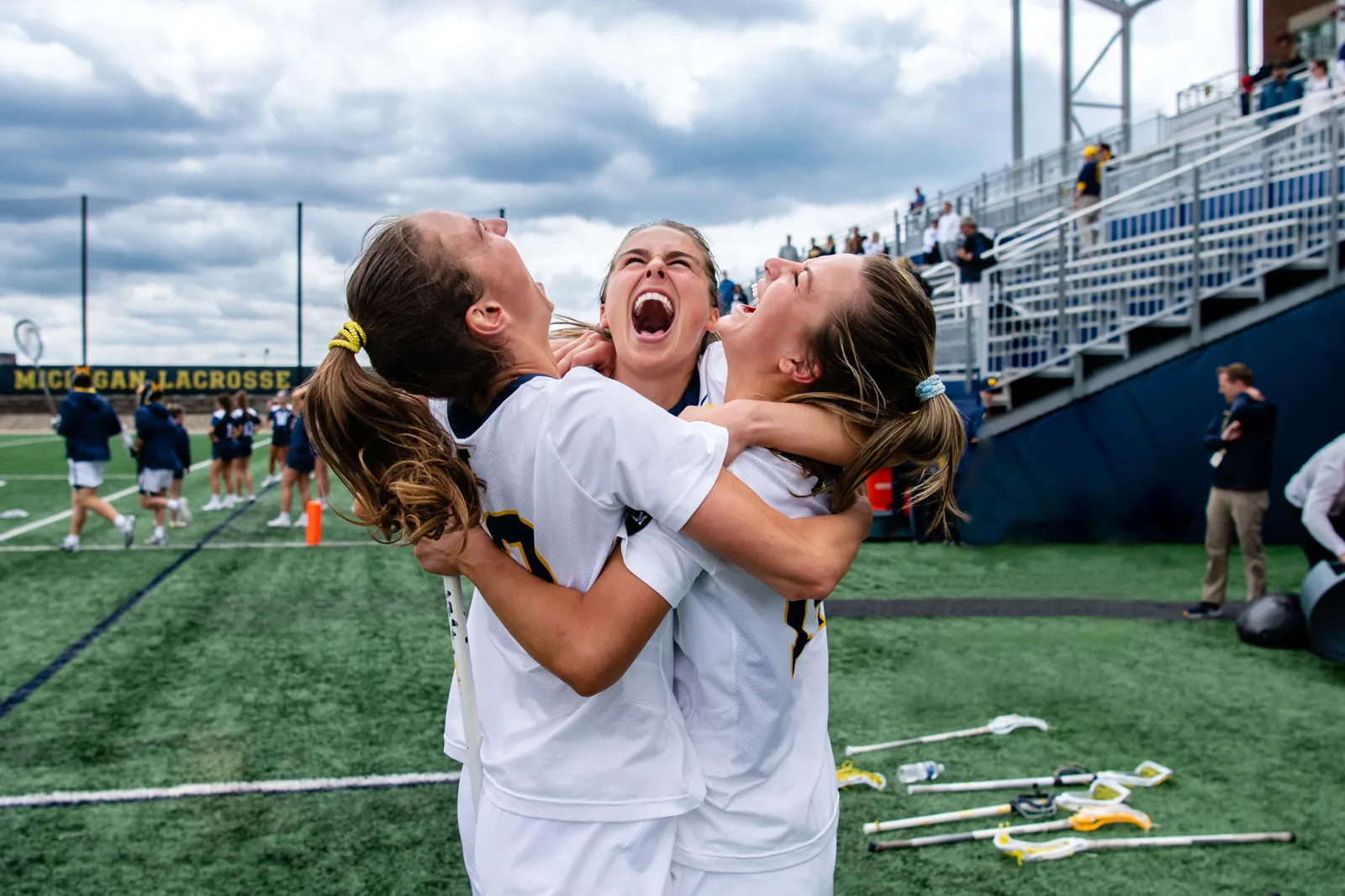 A trio of University of Michigan women's lacrosse players celebrate their Big Ten tournament victory over Penn State.