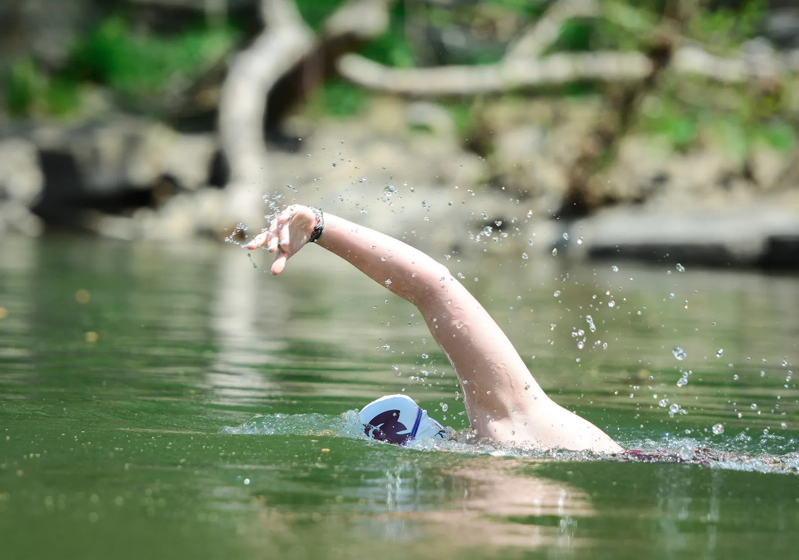 A Southern Virginia University swimmer open water swims across a river.