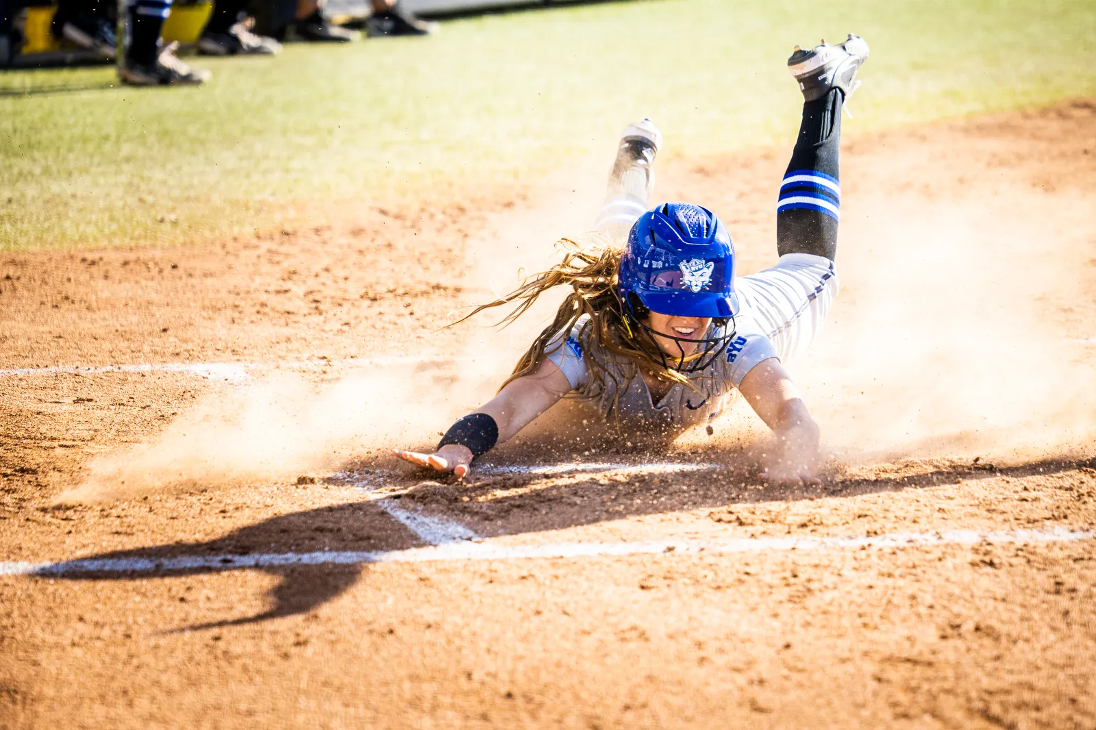 A BYU Softball player slides into home base to score for the team.