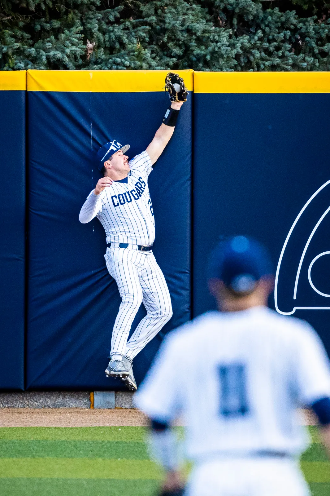 A BYU Baseball player smashes into the outfield padding as he steals a potential home run from the opposing team.