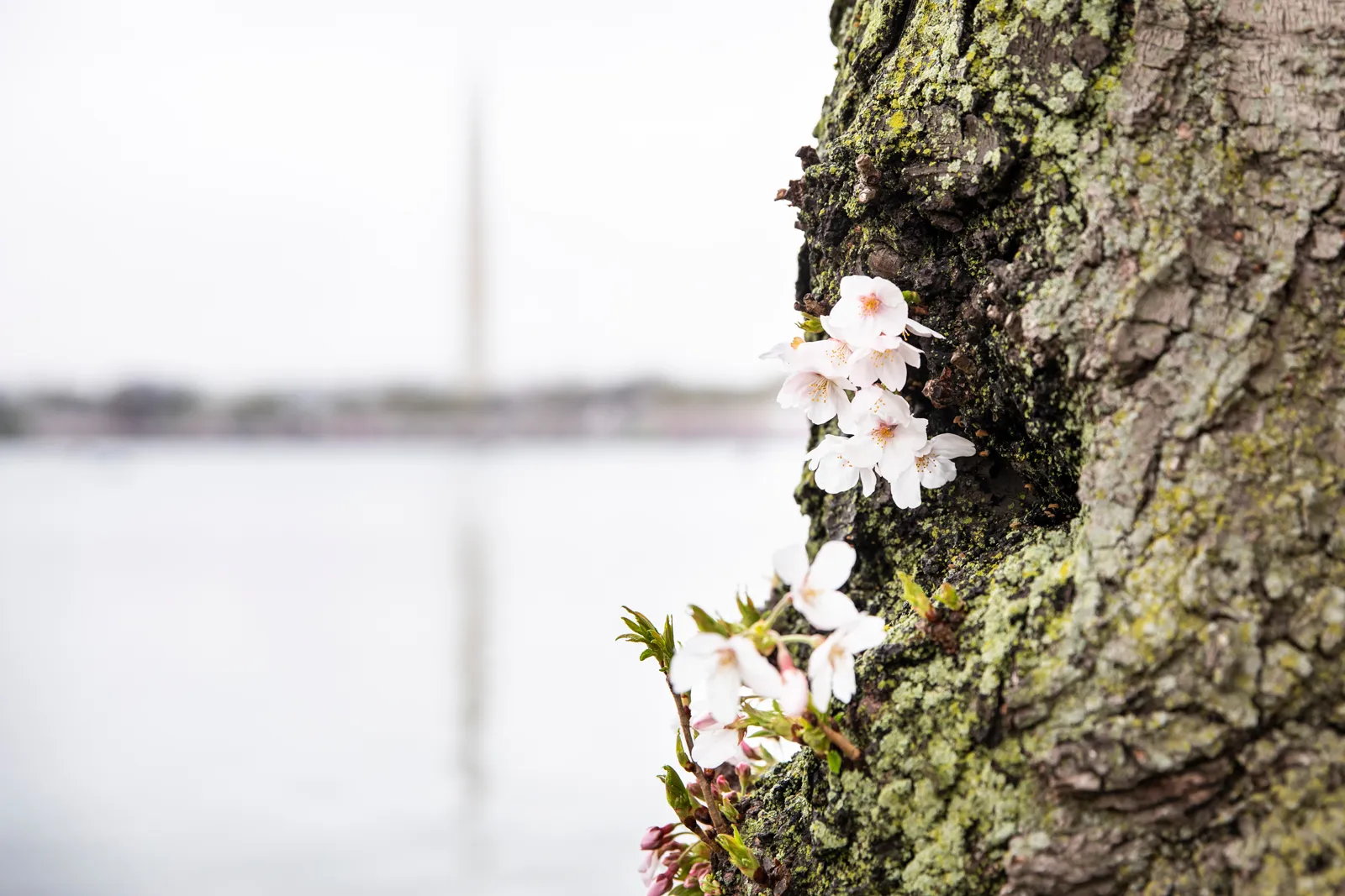 A group of small cherry blossoms bloom from the side of one of the few thousand of cherry blossom trees in Tidal Basin.