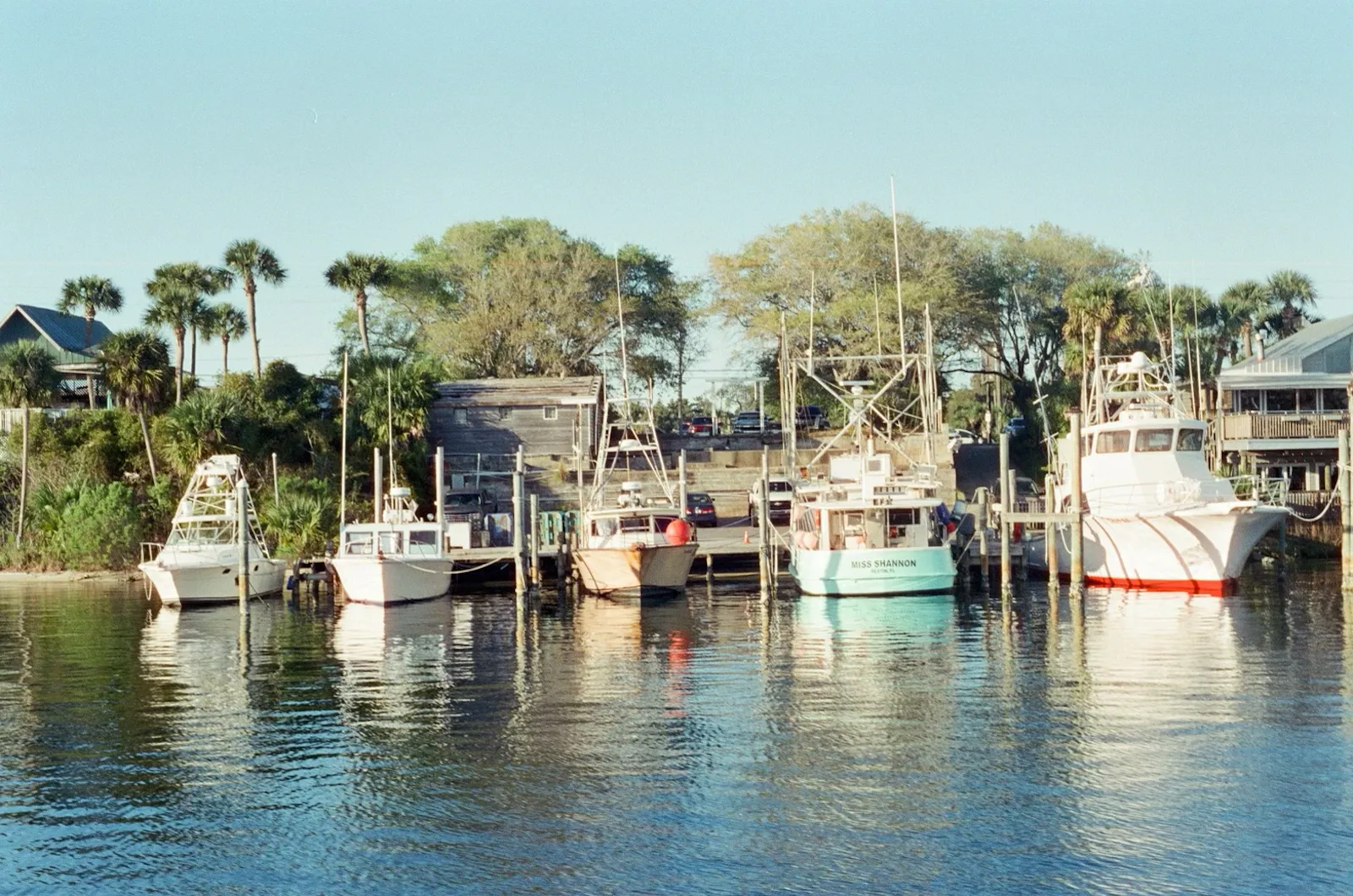 A few fishing boats docked in the Gulf of Mexico. Shot on 35MM Cinestill 400D.
