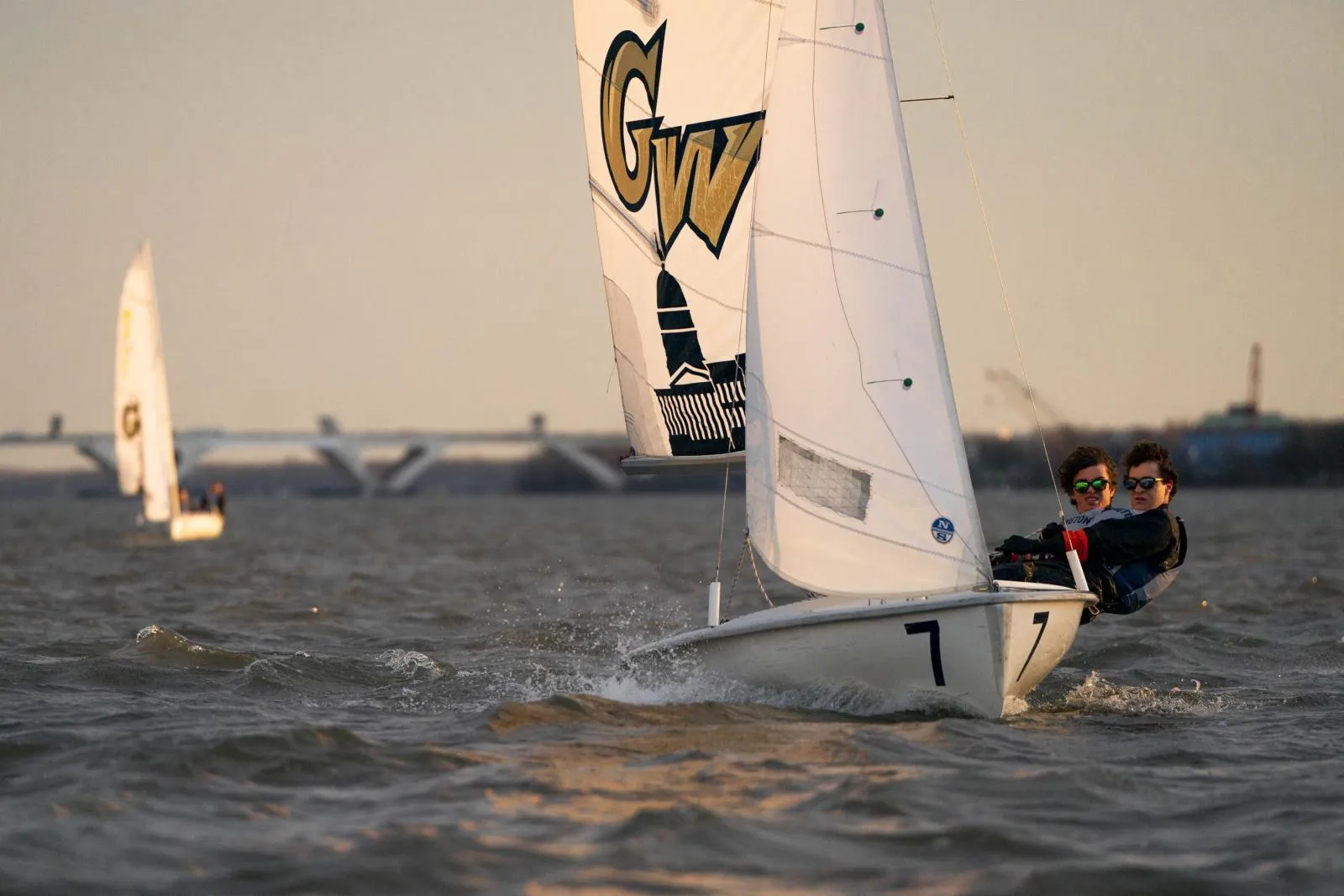 Members of the GW Sailing Team hike out to even out the weight of their boat during a racing drill.