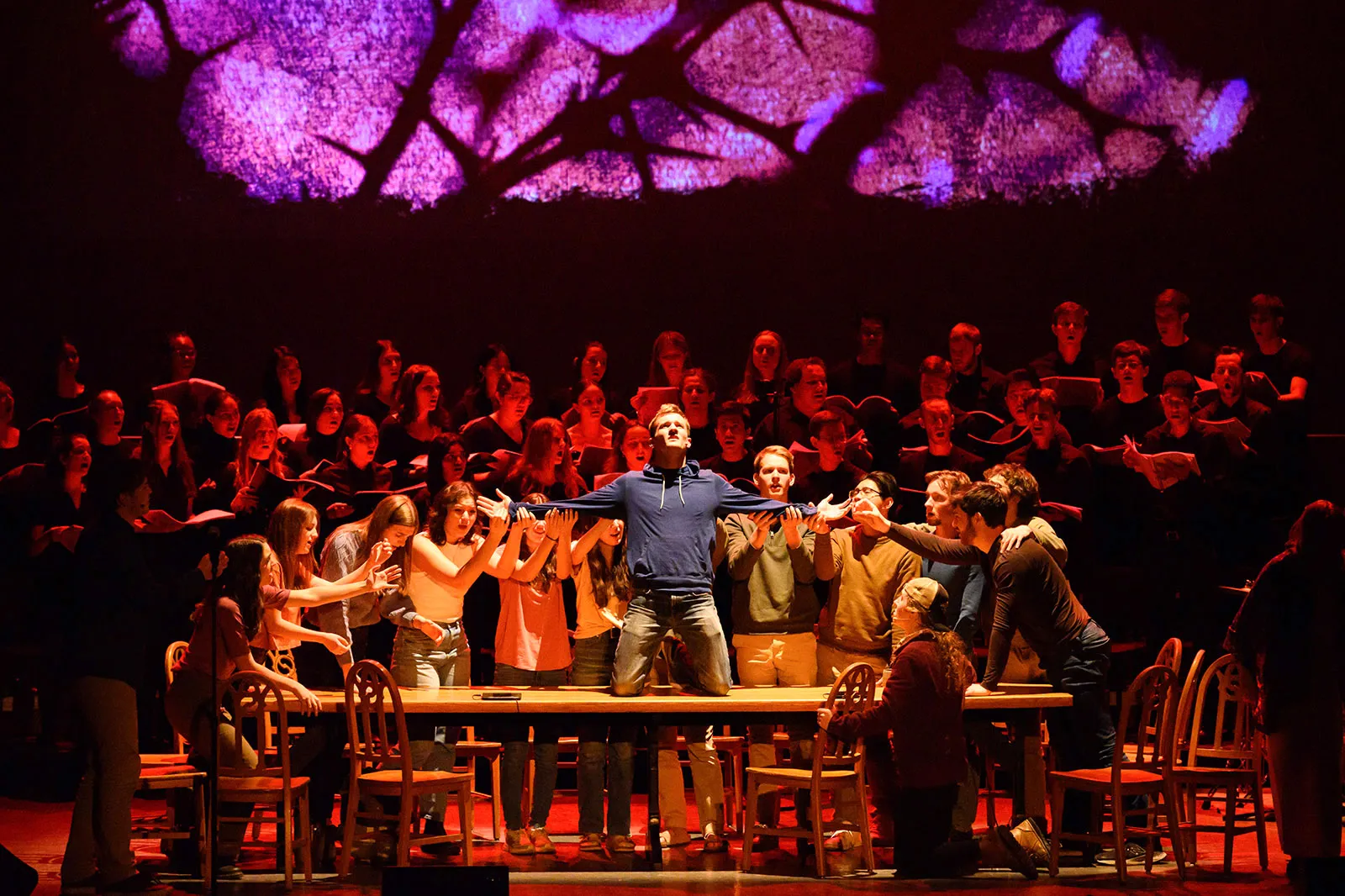Noah Gonring, center, portrays Jesus in a Folk Choir performance of “The Passion” at the Byham Theater in Pittsburgh, PA. The original interpretation of The Passion was written and arranged by Folk Choir director J.J. Wright. The Folk Choir performed in Naples, FL, Lauderhill, FL, Washington D.C., New York and Pittsburgh during Spring Break 2023.