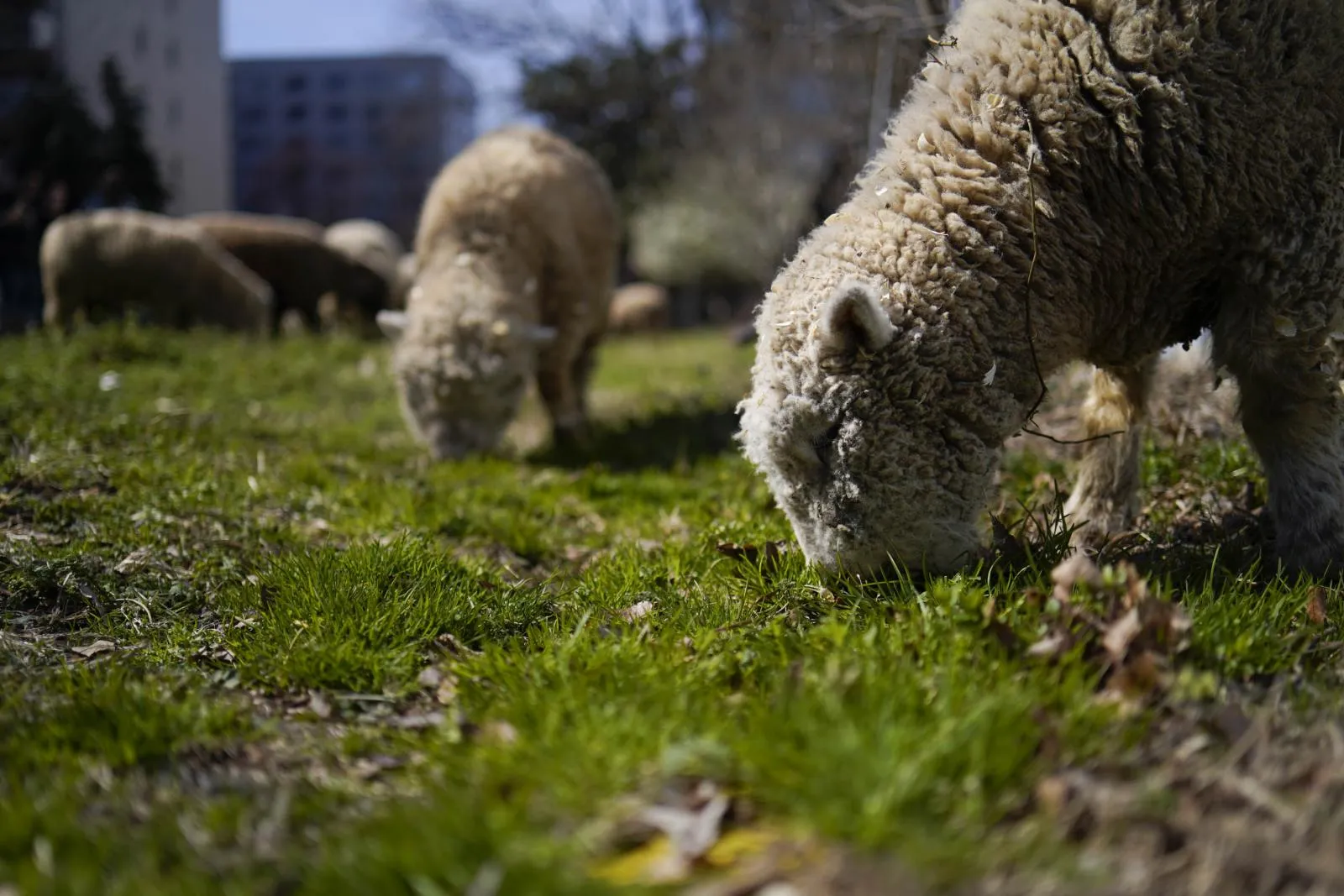 Sheep from the Lamb Mowers Company graze on the weeds within the George Washington University grow garden in Foggy Bottom, Washington, DC.