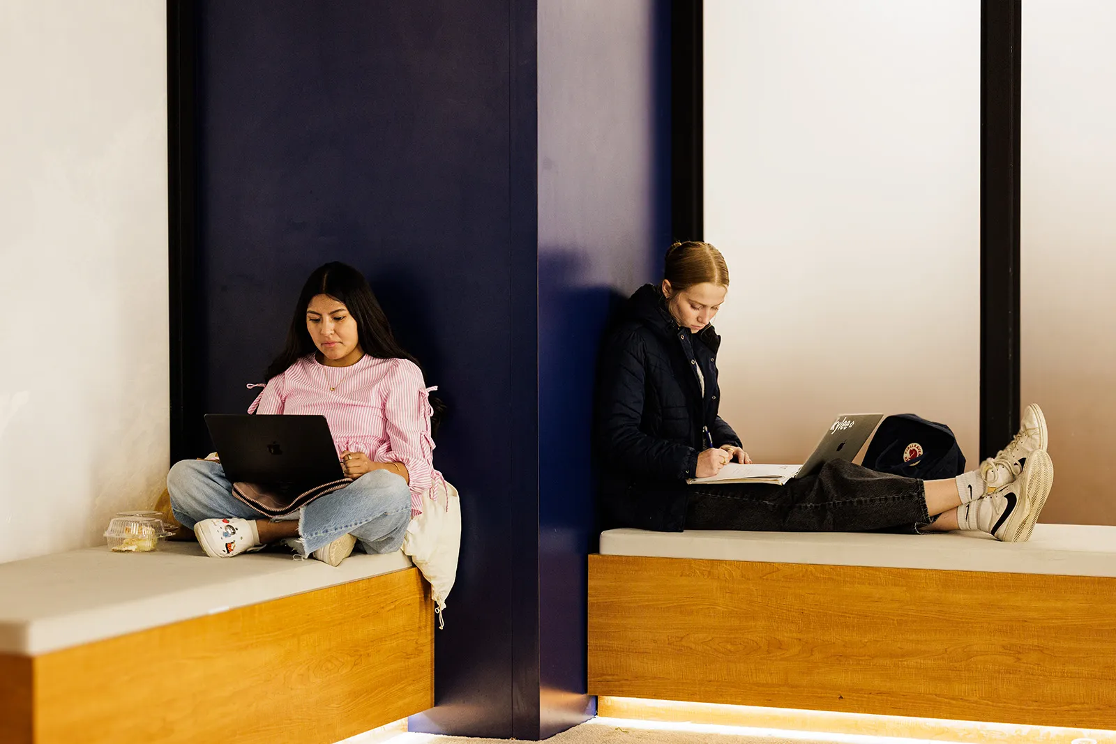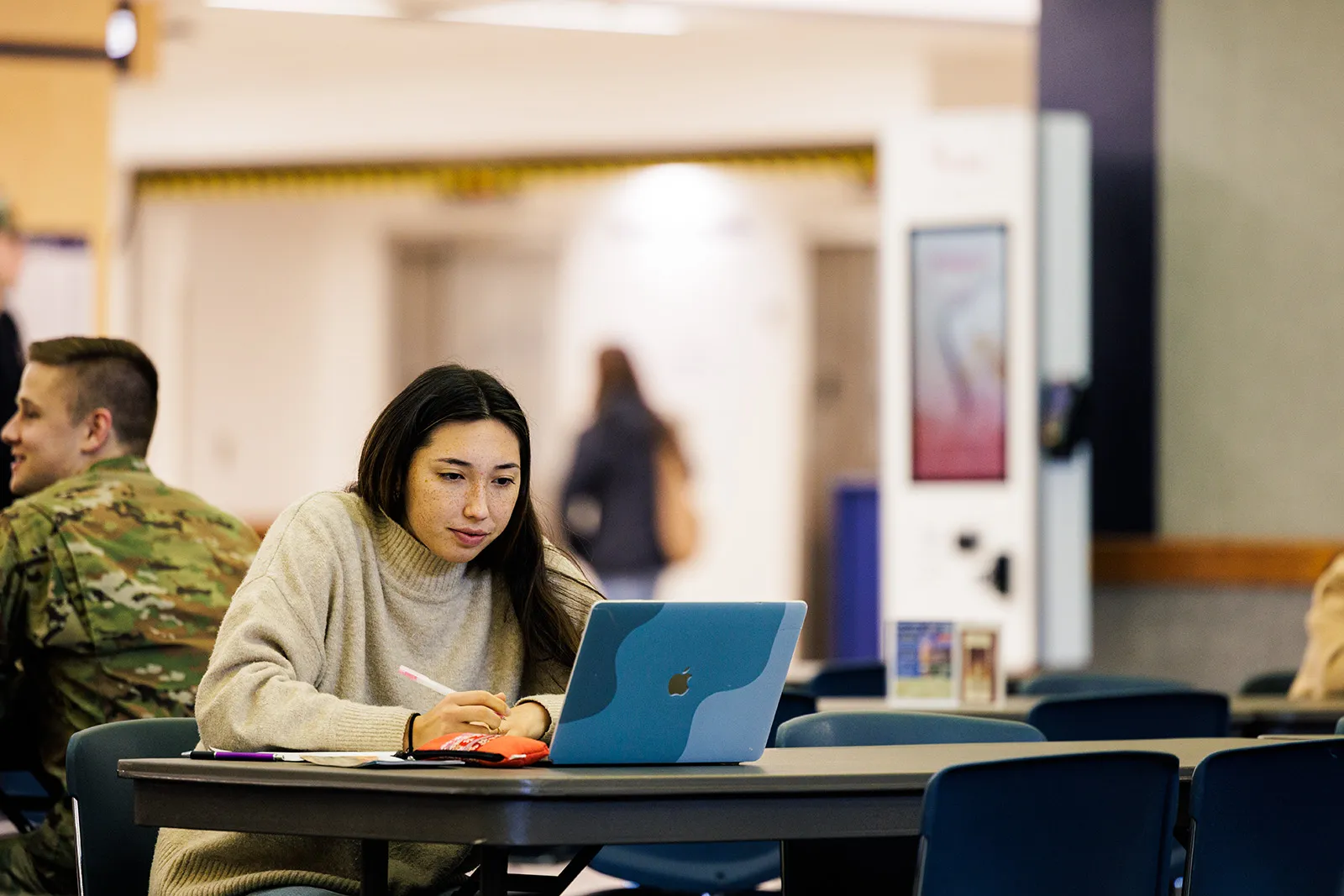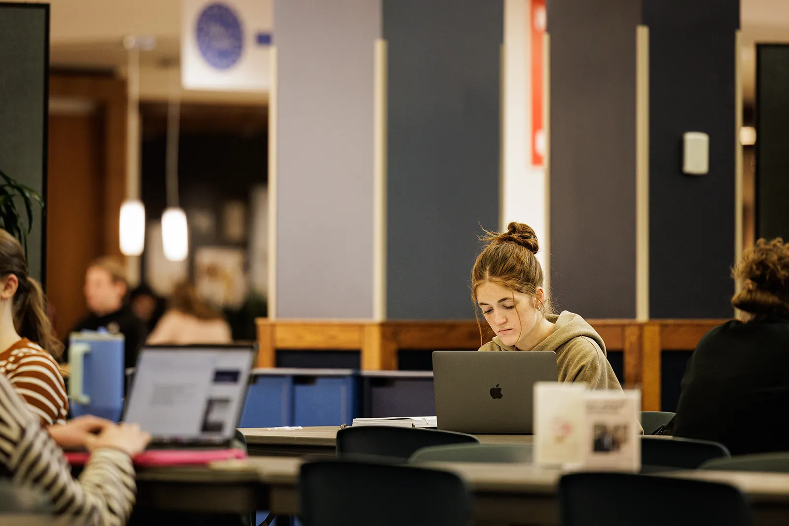 A student focuses on her latest assignment as she studies in the student center.