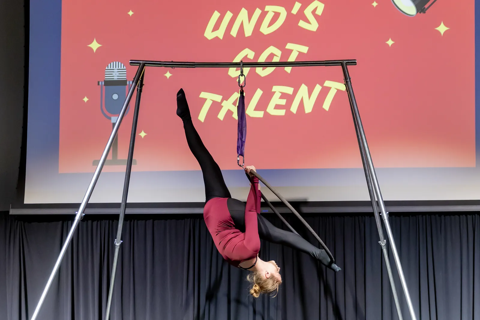 A student performs an aerial lyra routine in her free time, at UND's talent show.