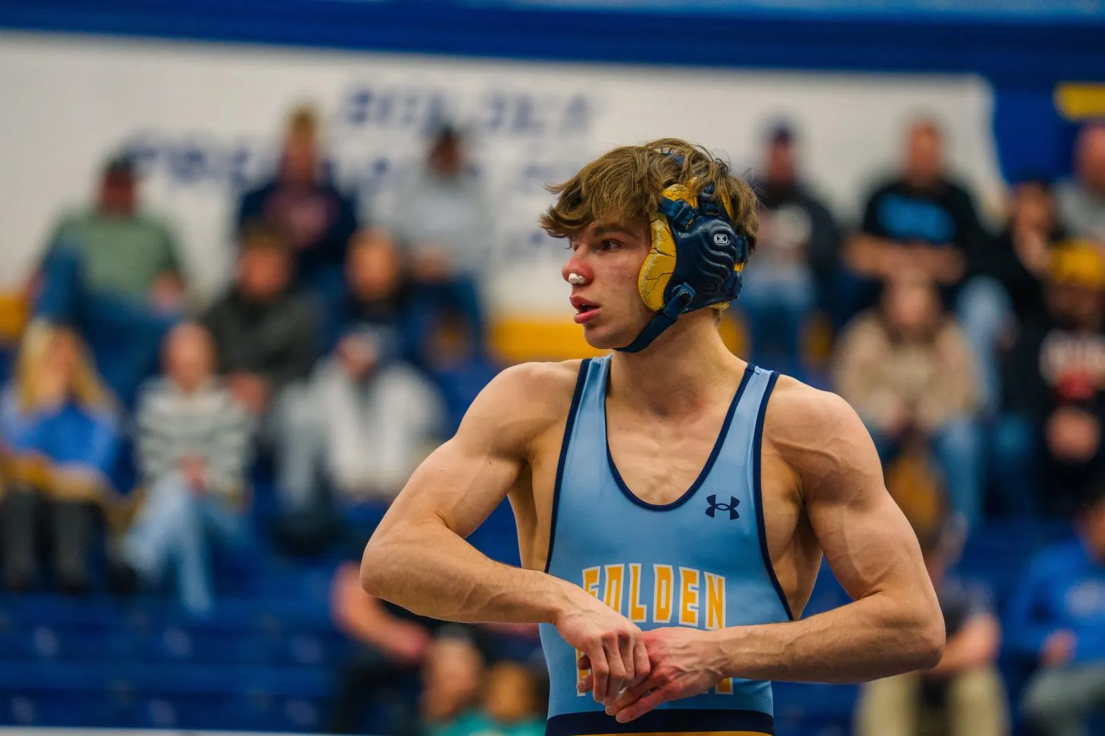 This images shows a Kent State Wrestler mid match and some of the effects the match has had on him that being a bloody nose and bruised knuckles