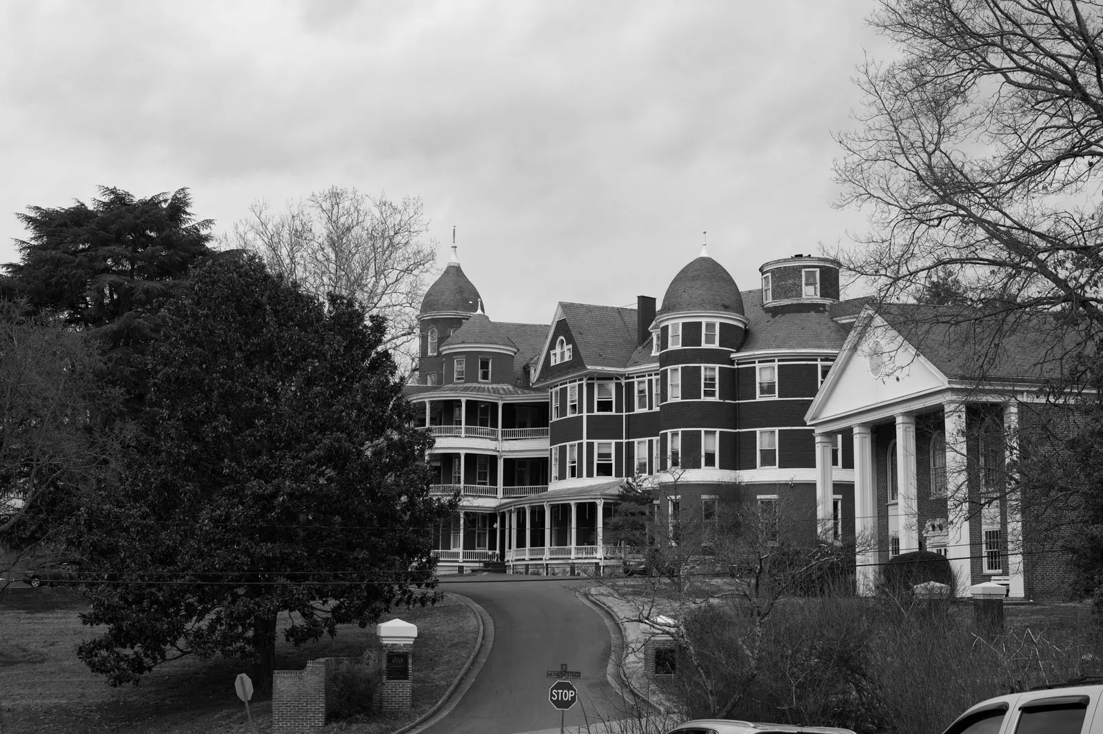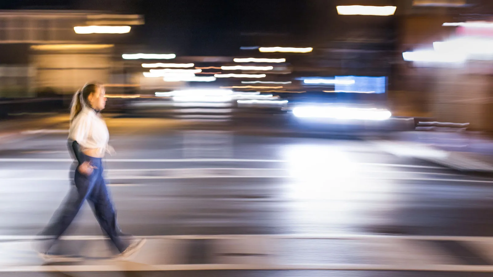 Photographed is a student from Southern Virginia University walking across a busy street in Lexington, Virginia.