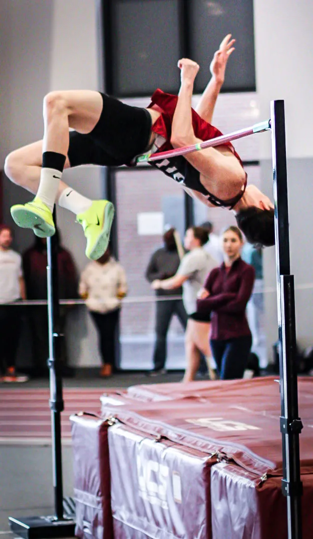 Southern Virginia University student athlete, Jayton Hall, participates in high jump in an indoor track meet in Roanoke, Virginia.