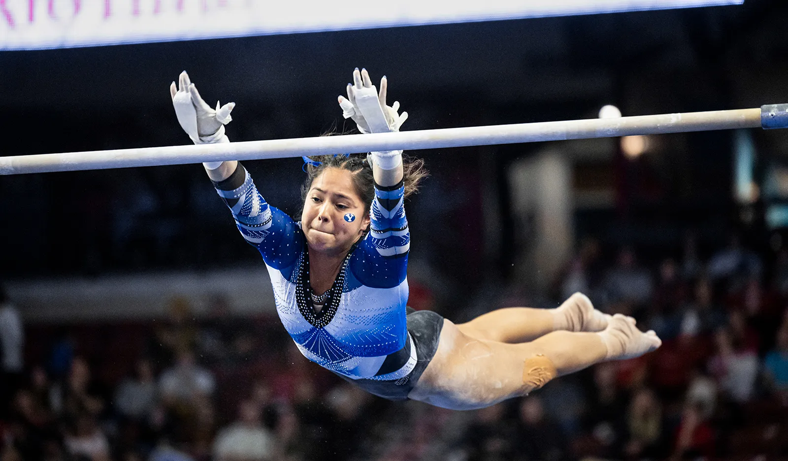 Student athlete transfers between bars during routine and reaches for the higher bar after a full twist.