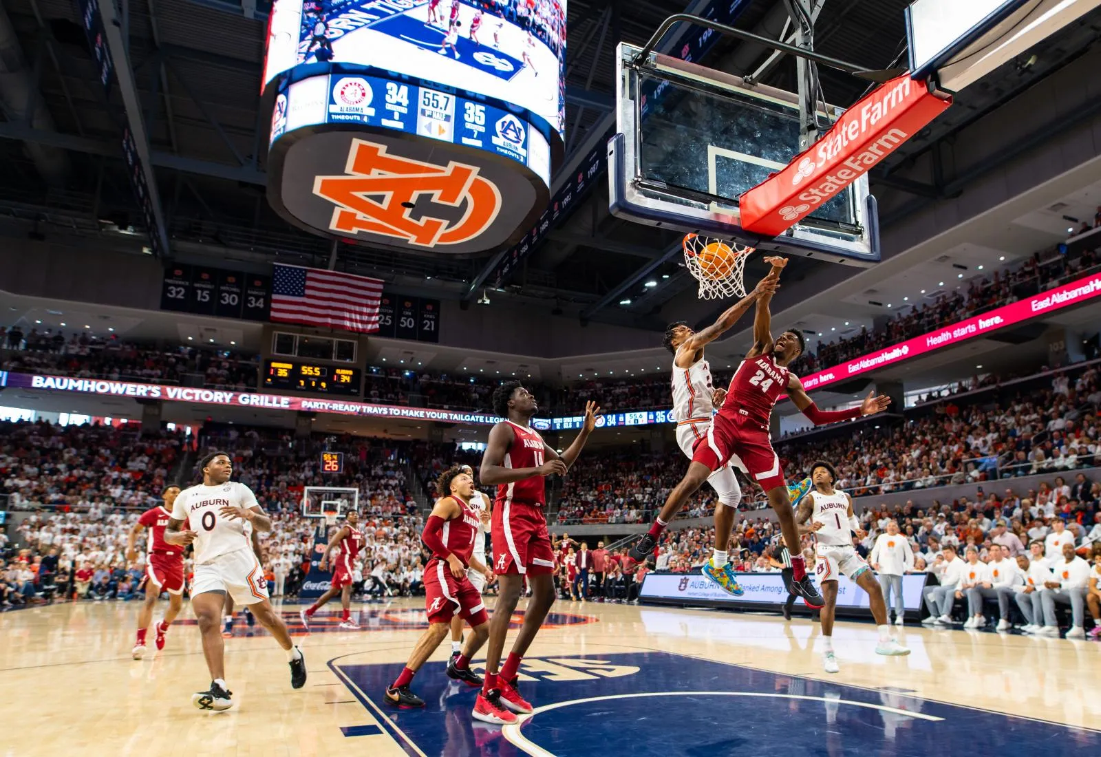 Alabama shooting guard Brandon Miller (24) posterizes an Auburn defender as the Crimson Tide defeats Auburn 77-69 on Feb. 11, 2023 at Neville Arena in Auburn, AL.